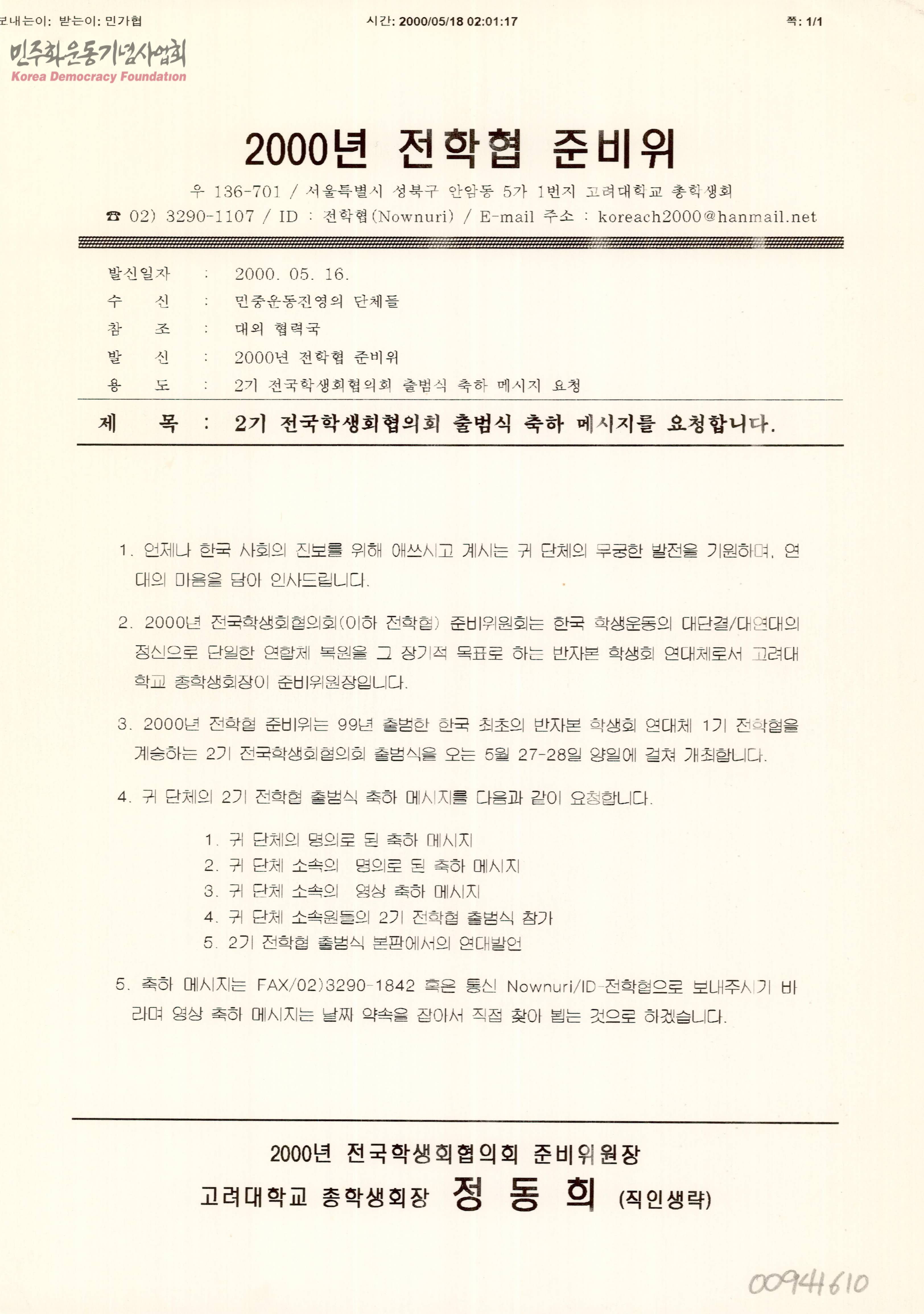 - 전학협 출범식에 대한 축하 메시지를 요청하며 메시지의 형태와 제출 방법 등을 담은 문서