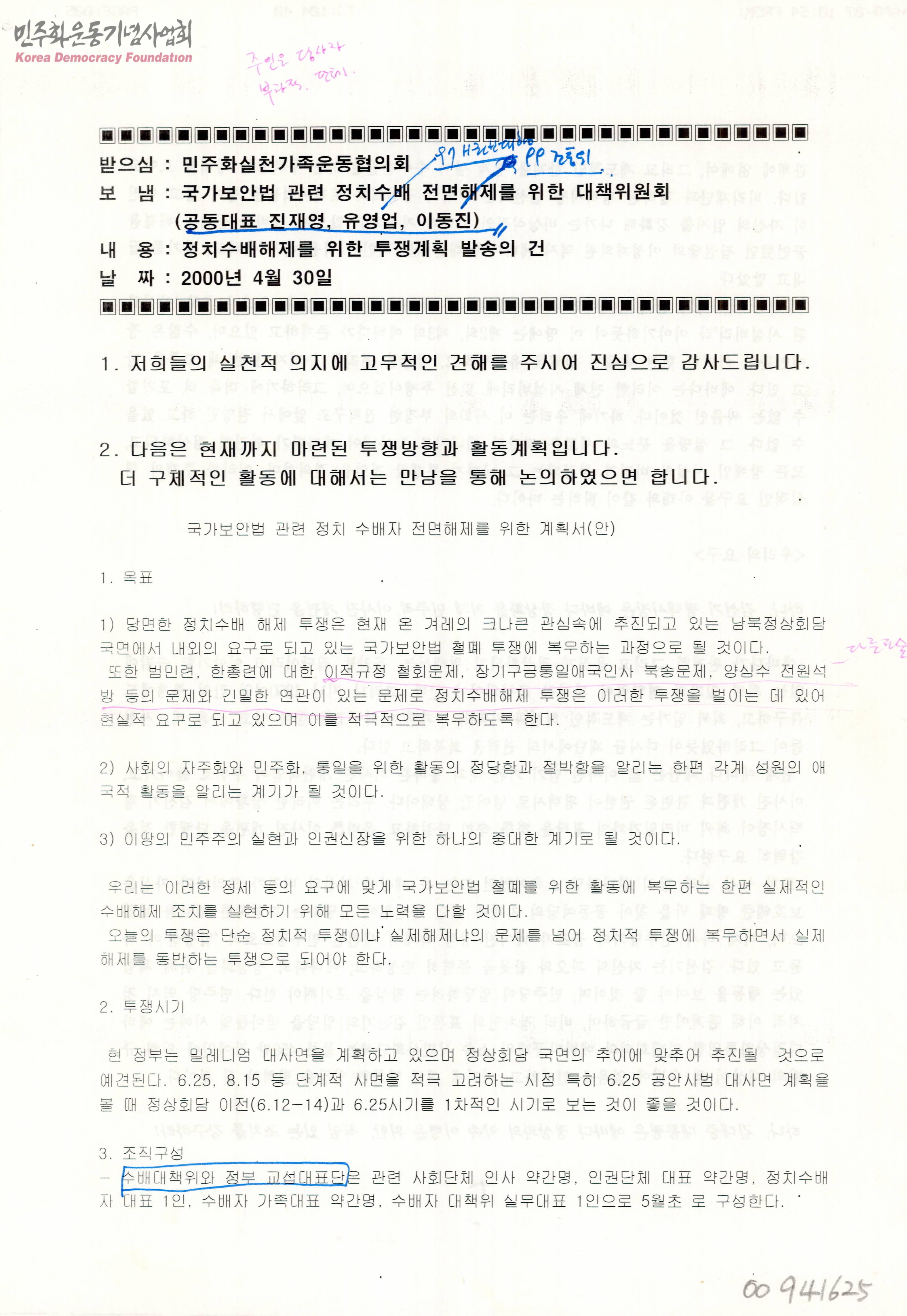 - 정부의 밀레니엄 대사면 계획에 맞추어 국보법 관련 정치 수배자들의 수배 전면해제를 위해 세운 계획서가 담긴 문서로 목표와 투쟁 시기와 방안 등이 포함되어 있음
