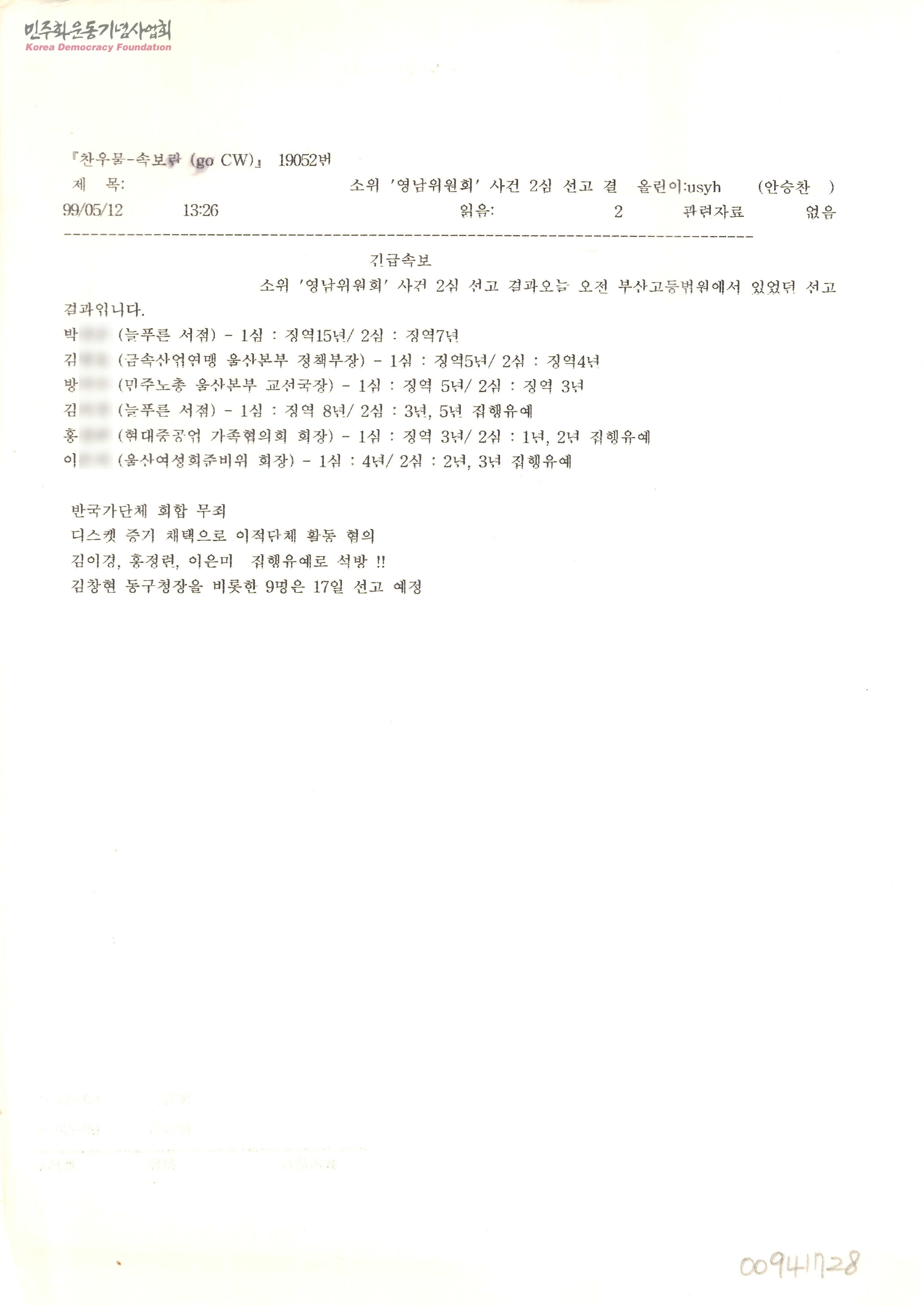 - 부산고등법원 선고 결과만 속보로 알린 문서로 박경순, 김명호, 방석수, 김이경, 홍정련, 이은미의 선고 내용을 확인할 수 있는 문서