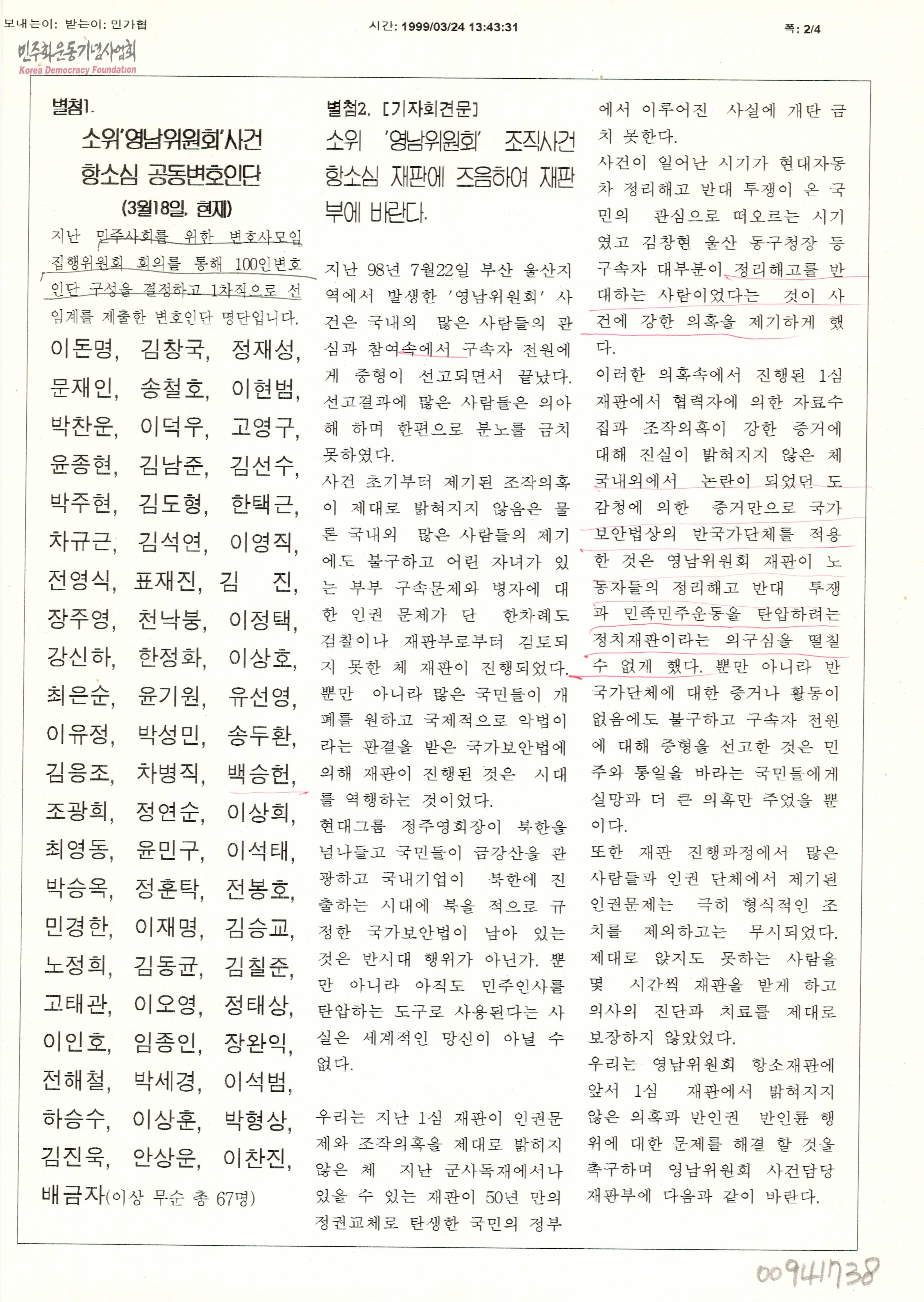 - 소위 '영남위원회' 사건 항소심 공동변호인단의 명단과 항소심 재판을 앞두고 재판부에게 바라는 기자회견문의 내용을 정리한 별첨