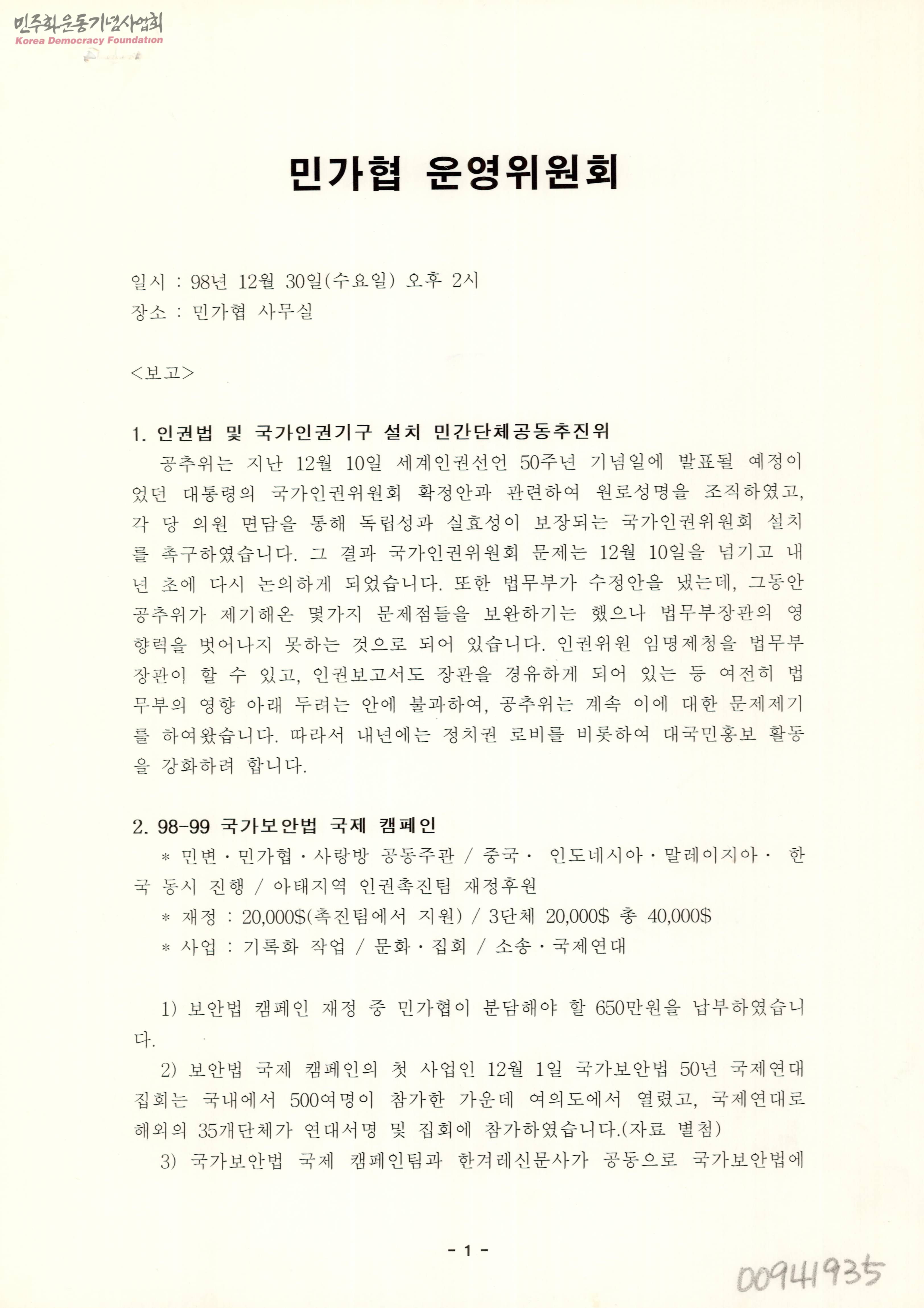 - 세계인권선언 50주년 기념일에 발표될 예정이던 국가인권위원회 확정안과 관련하여 독립성과 실효성이 보장되는 위원회 설치를 촉구했다는 내용 등의 보고내용을 담은 문서
