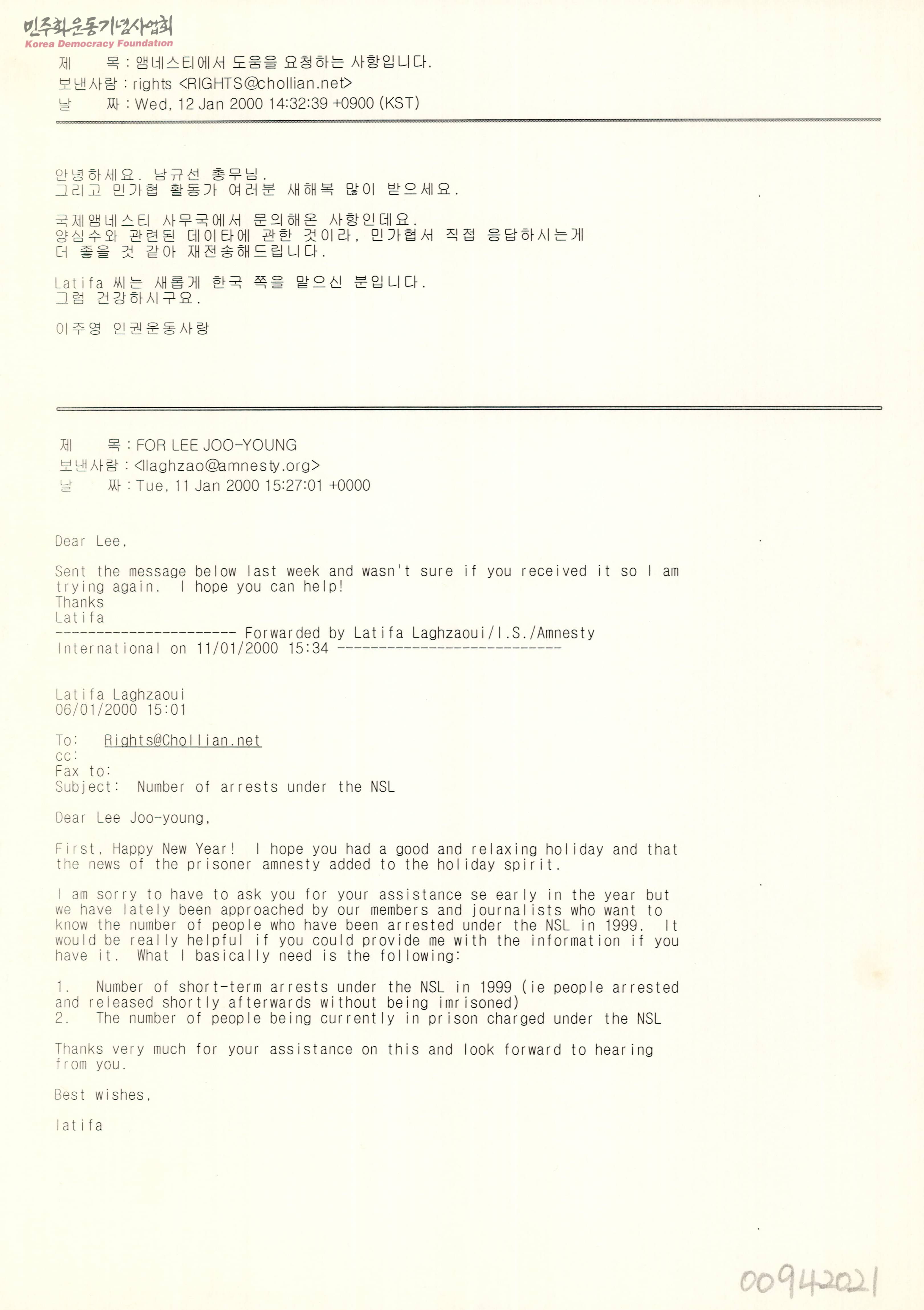 - 엠네스티에서 인권운동사랑 단체에게 양심수 현황 데이터를 요청하는 메일을 민가협에게 전달한 메일 내용