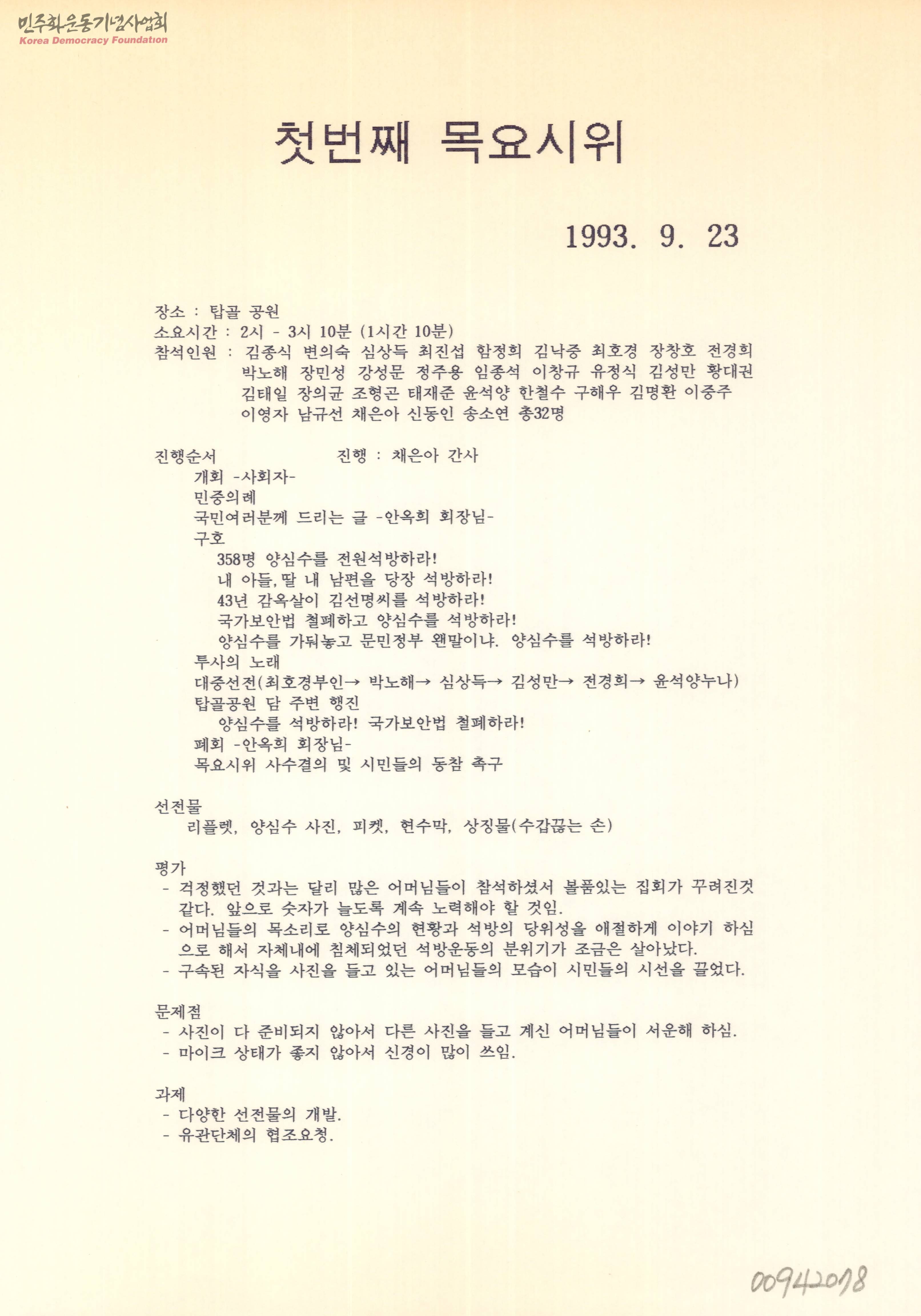 - 집회 장소, 소요시간, 참석 인원, 진행 순서, 사용했던 선전물 및 집회에 대한 전반적인 평가와 개선사항 등을 정리한 문서