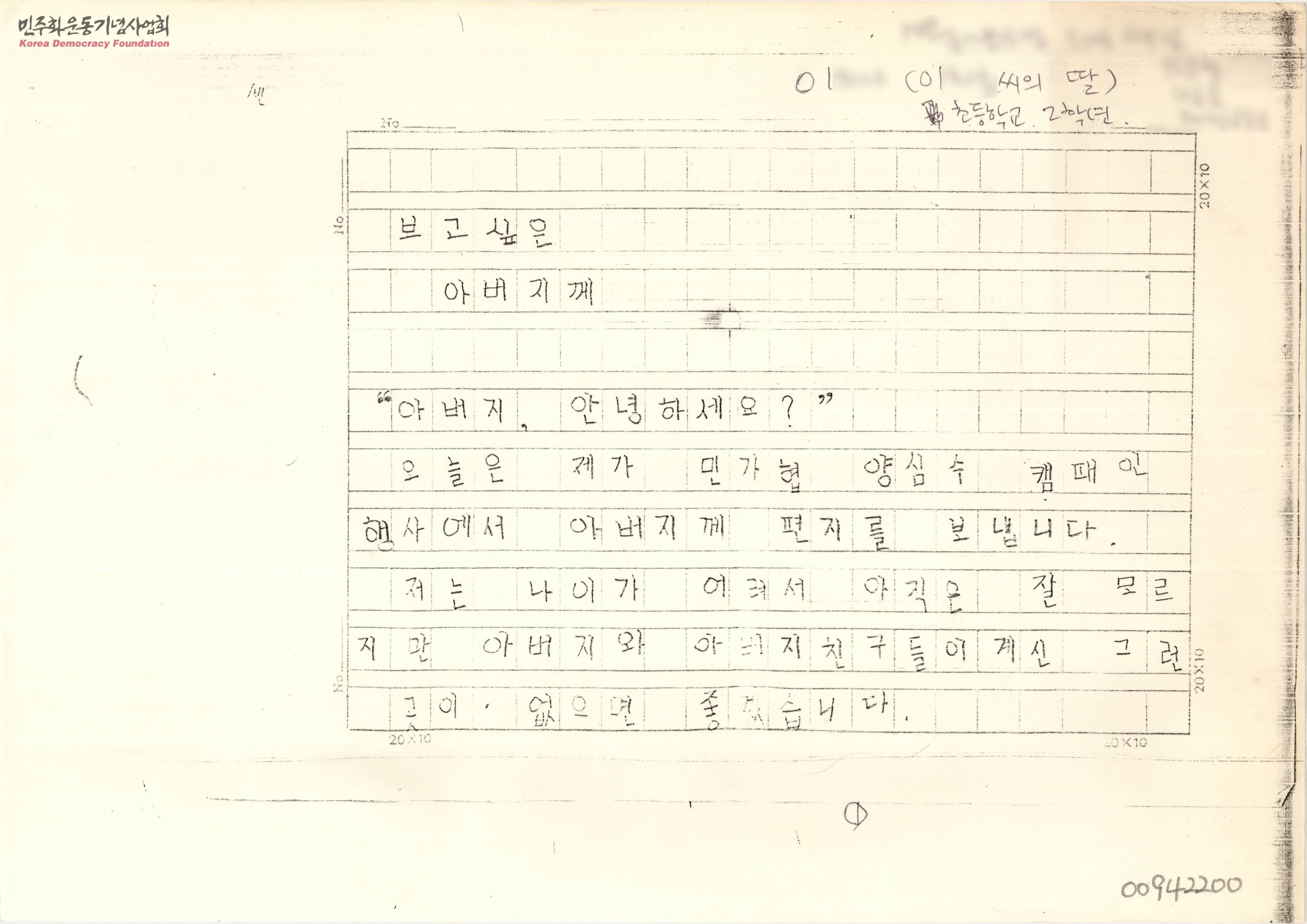 - 국가보안법 위반 사건으로 7년형을 받은 대전교도소 수감자 이화춘씨의 딸 이하나의 아버지에게 보내는 편지