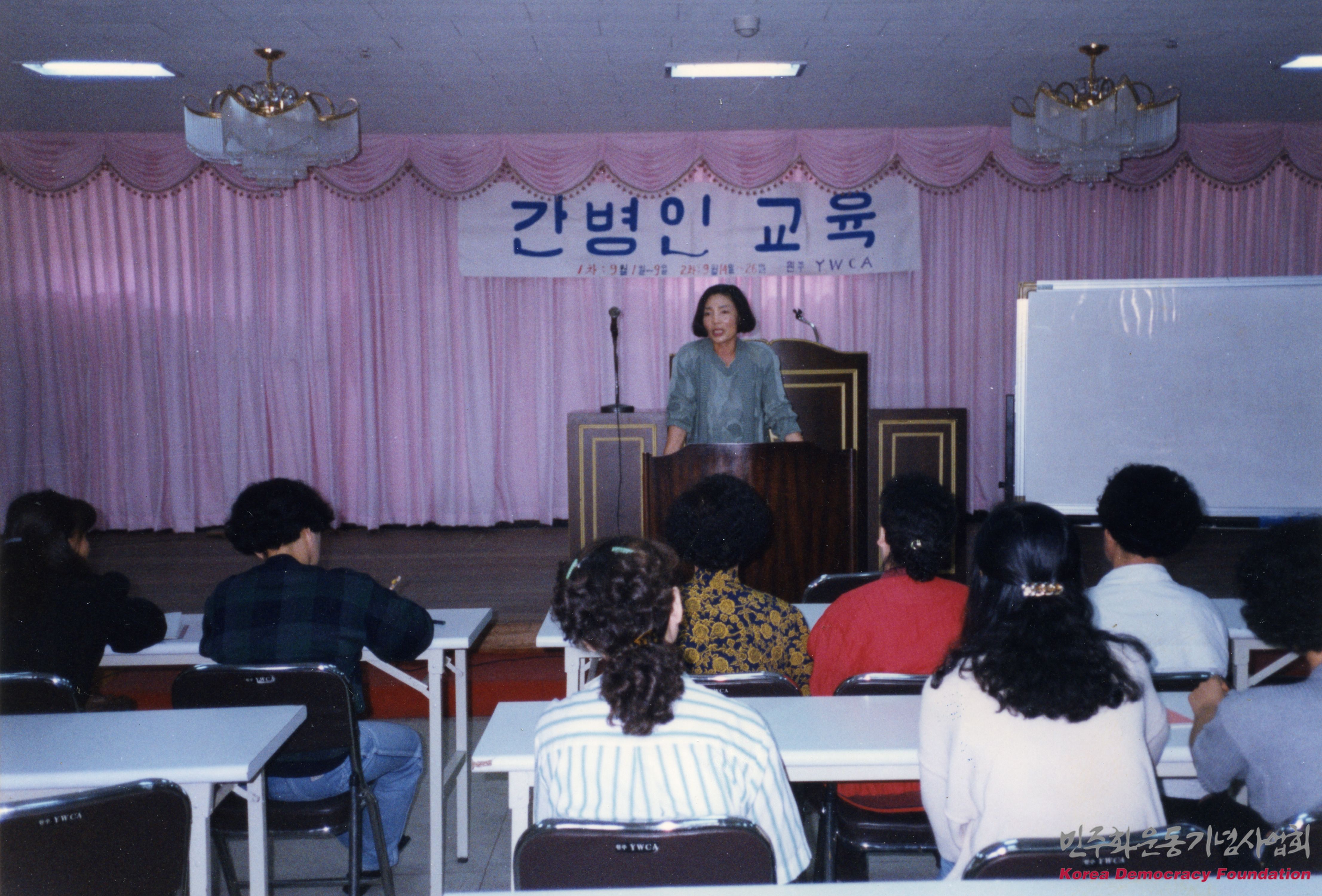 - 간병인 교육에서 여성 강사가 강연을 하는 모습