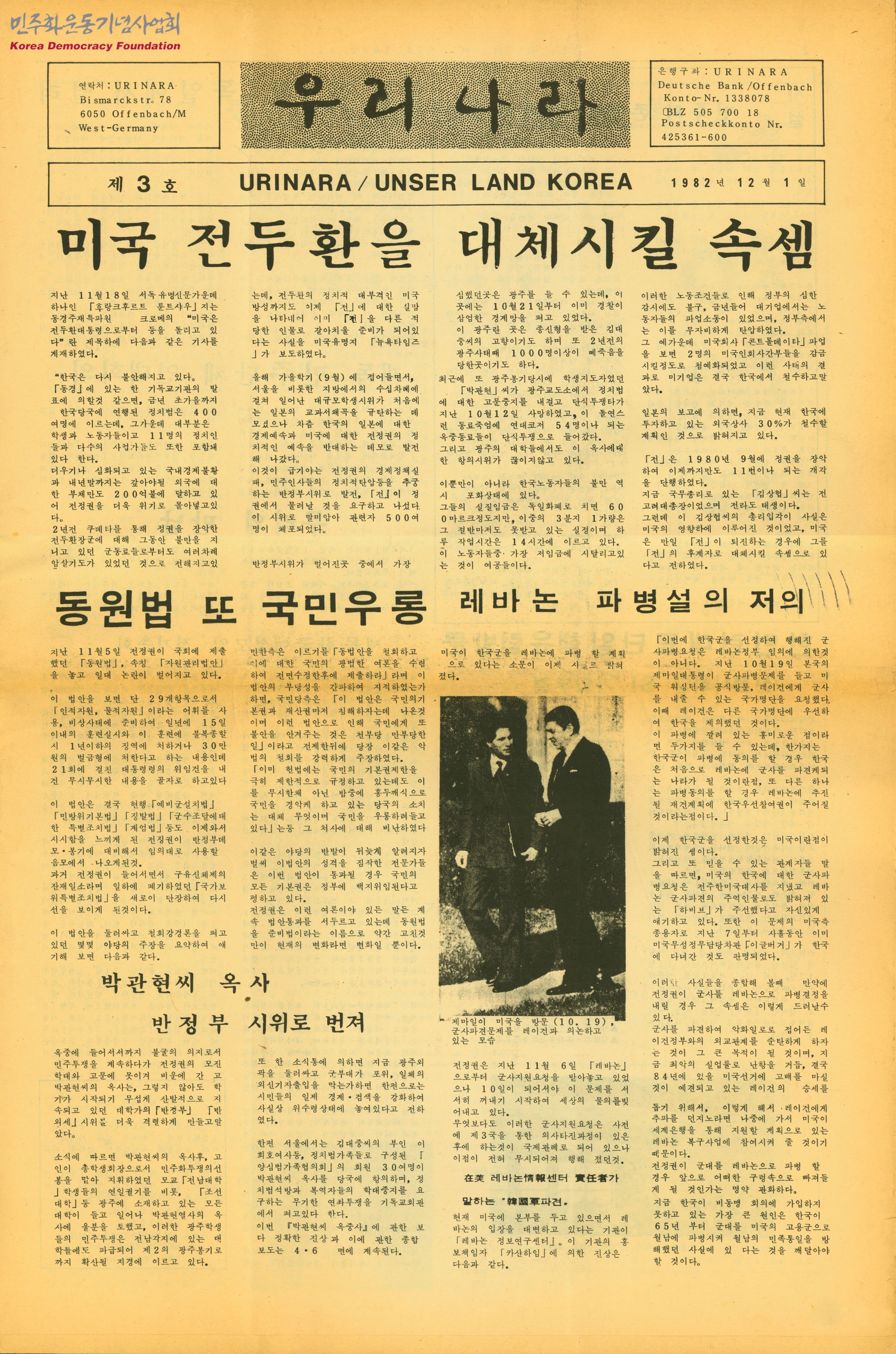 - 미국 전두환을 대체시킬 속셈, 박관현씨 옥사 그후 소식, 한일관계 좌담회 등의 내용을 다루는 신문