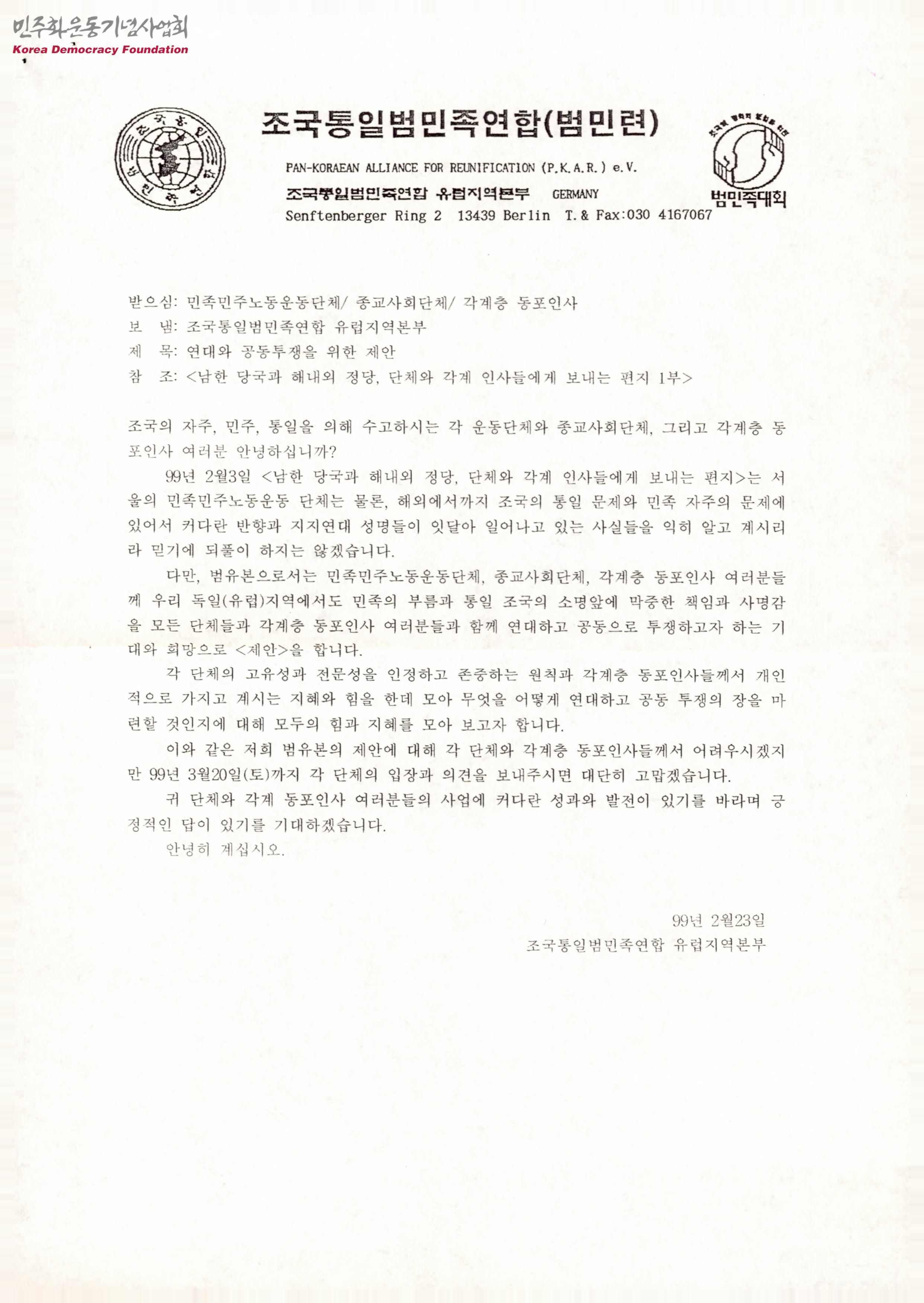 연대와 공동투쟁을 위한 제안[범민련 유럽본부가 남한 당국과 해내외 정당, 단체와 각계 인사들에게 보내는 편지]