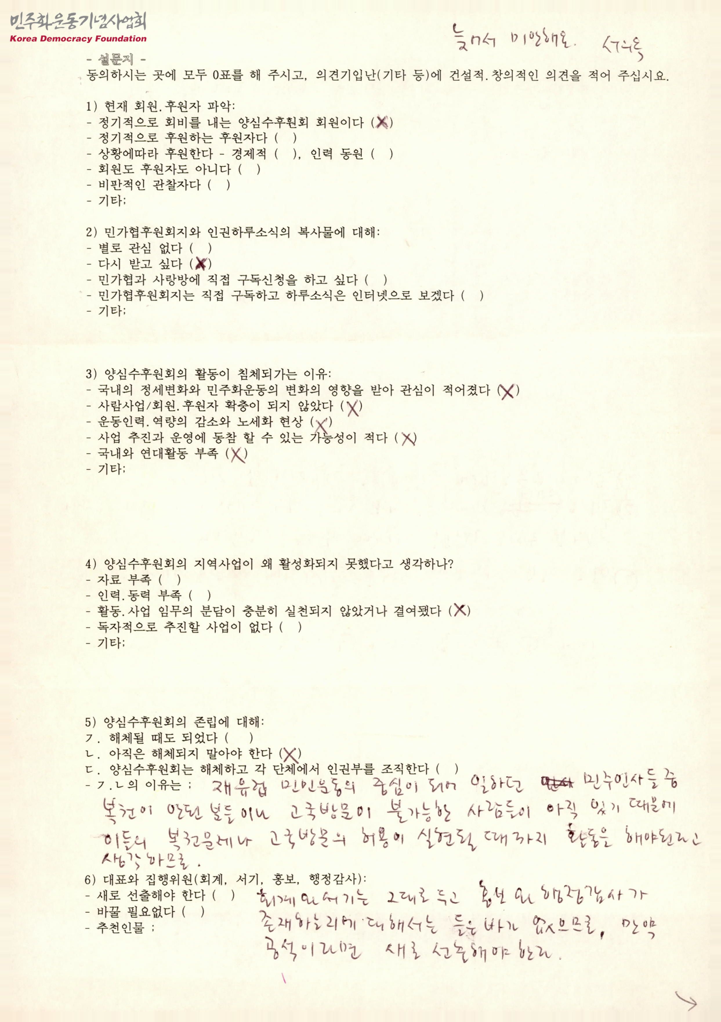 - 양심수후원회 활동이 침체되어가는 이유, 양심수후원회의 존립여부, 새 대표와 집행위에 바라는 점 등의 항목이 포함된 설문지