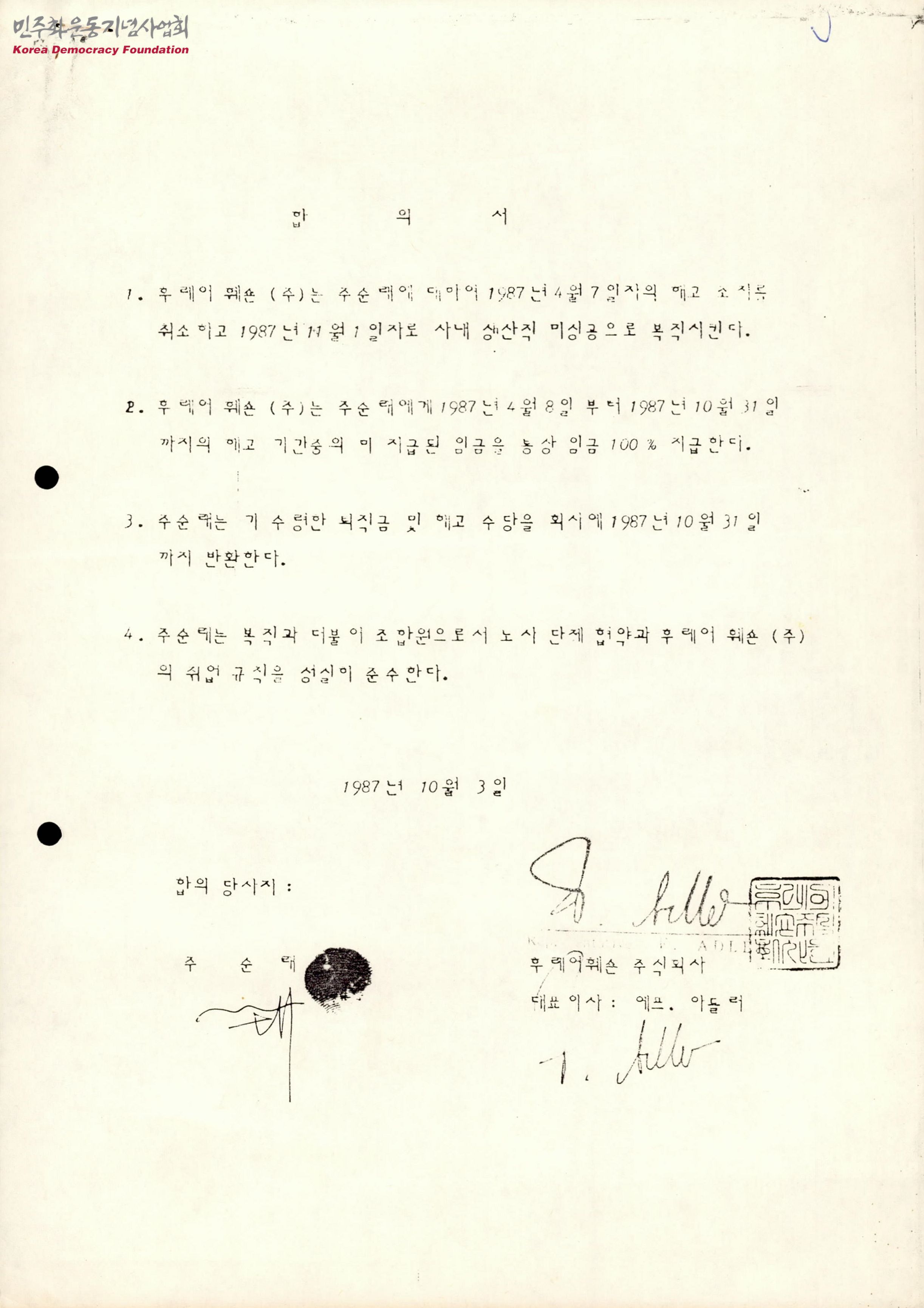 - 주순래의 복직과 미지급된 임금을 지급하는 내용 등이 포함된 합의서
