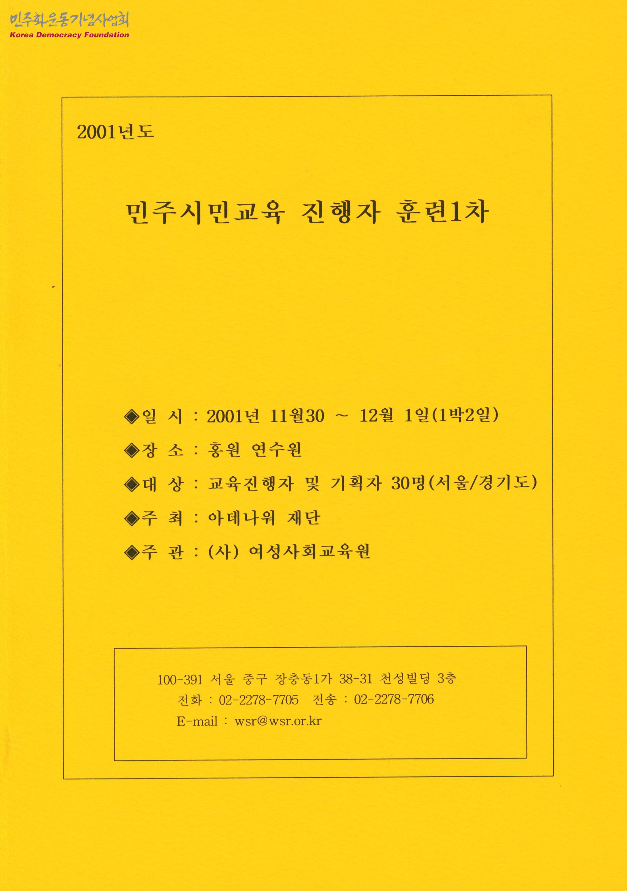 - 프로그램 일정, 벽허물기, 정치교육의 원칙, 정치교육의 방법들Ⅰ,Ⅱ,Ⅲ, 진행자의 역할과 자세, 정치교육이론, 기구를 익히는 교육, 법교육, 경제학습, 환경교육, 정치교육과제로서의 미디어교육, 다문화학습 등의 내용을 포함한 자료집