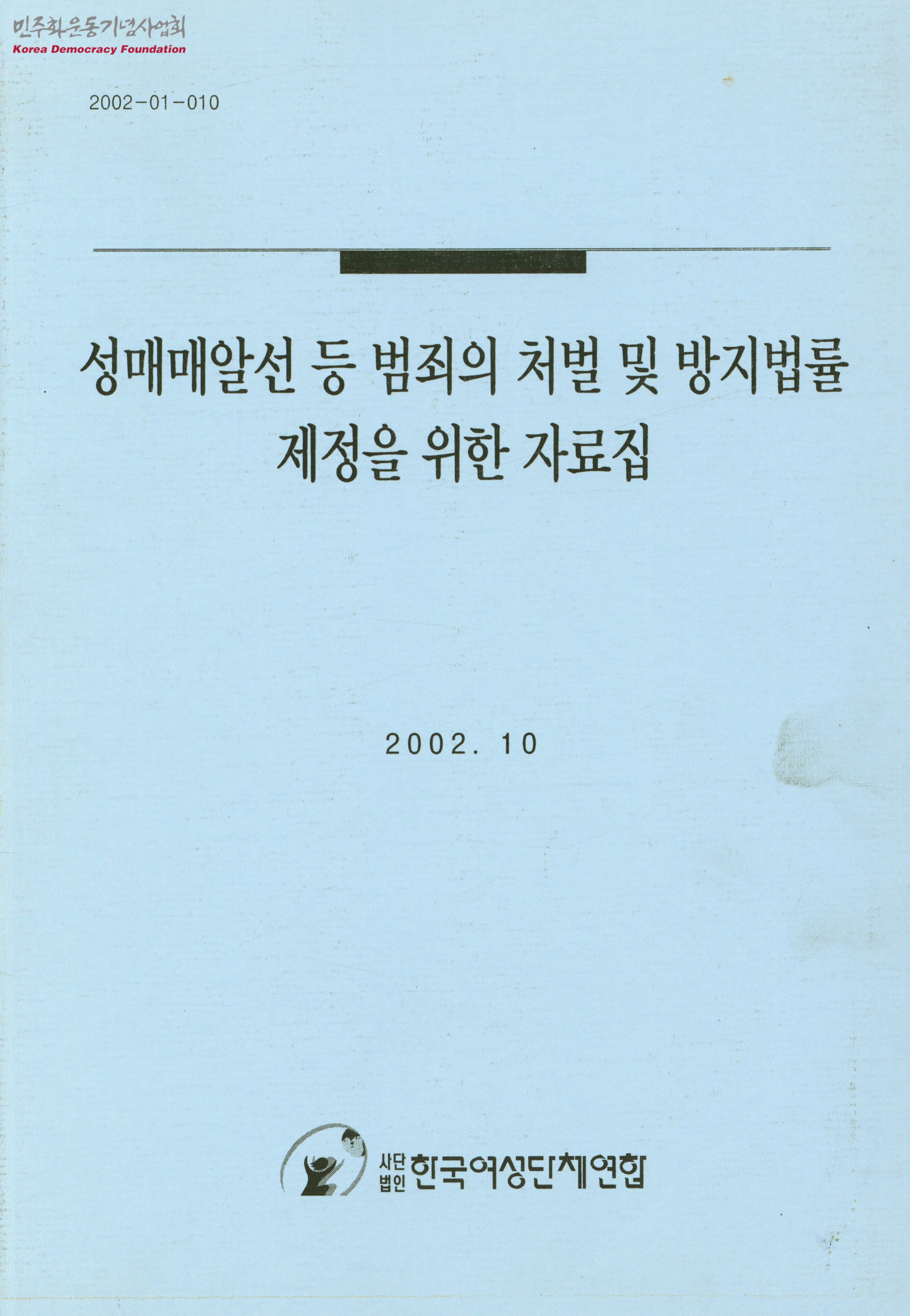 - 성매매알선 등 범죄의 처벌 및 방지법률 제정을 위한 자료집으로 목차는 다음과 같음 1부 국회에 계류중인 '성매매방지법(안)' 자료 2부 성매매·인신매매 관한 실태 자료 3부 성매매·인신매매 관련 국제조약 및 입법사례