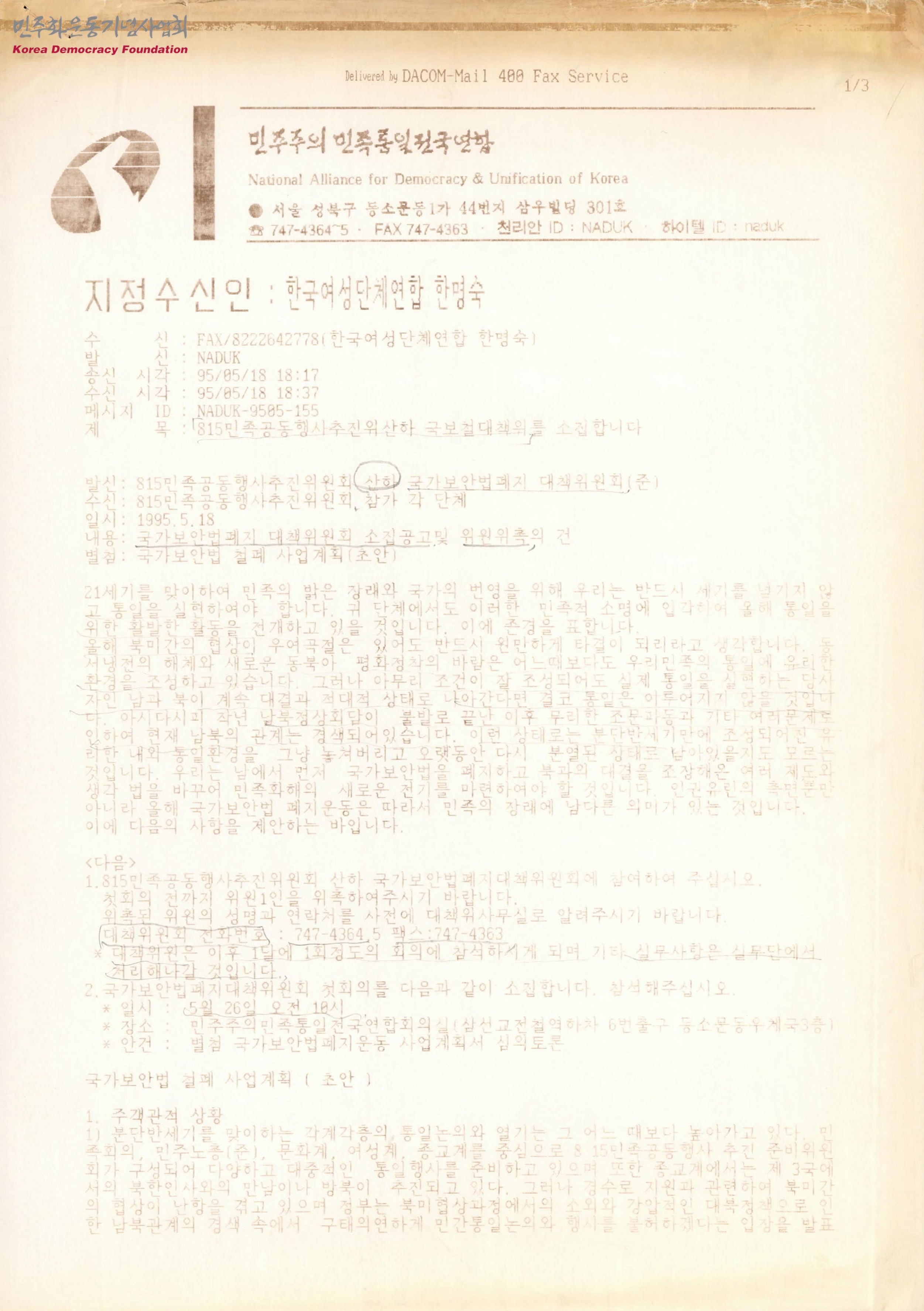 815민족공동행사추진위산하 국보철대책위를 소집합니다[수신:한국여성단체연합 한명숙,발신:민족주의민족통일전국연합]