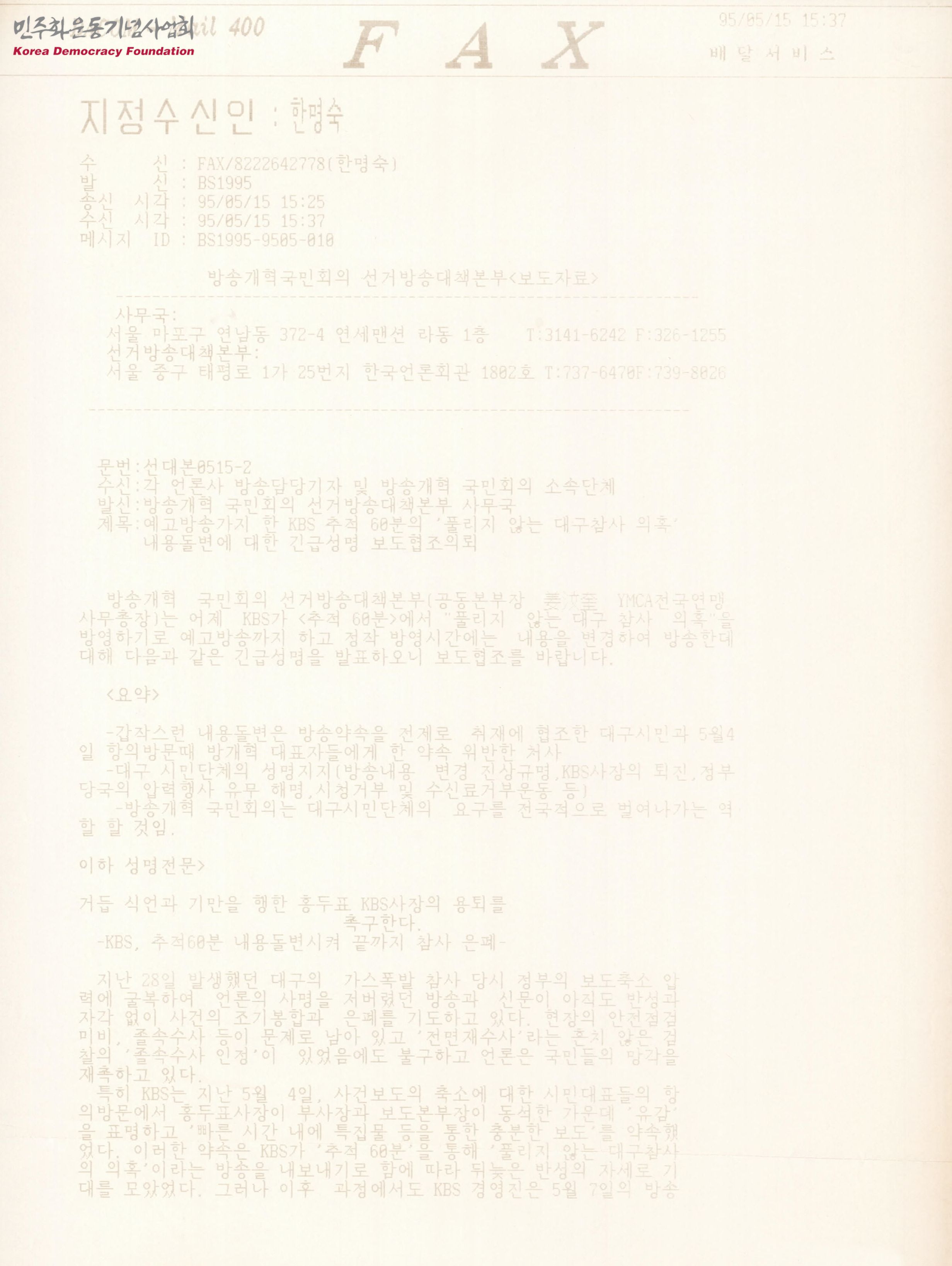 - 각 언론사 기자 및 방송개혁 국민회의 소속단체에 보내는 보도자료로, KBS의 갑작스러운 내용 돌변에 대한 비판과 대구 시민단체의 성명을 지지한다는 내용을 포함하고 있으며 거듭 식언과 기만을 행한 홍두표 KBS사장의 용퇴를 촉구한다는 내용의 긴급성명서가 첨부되어 있음