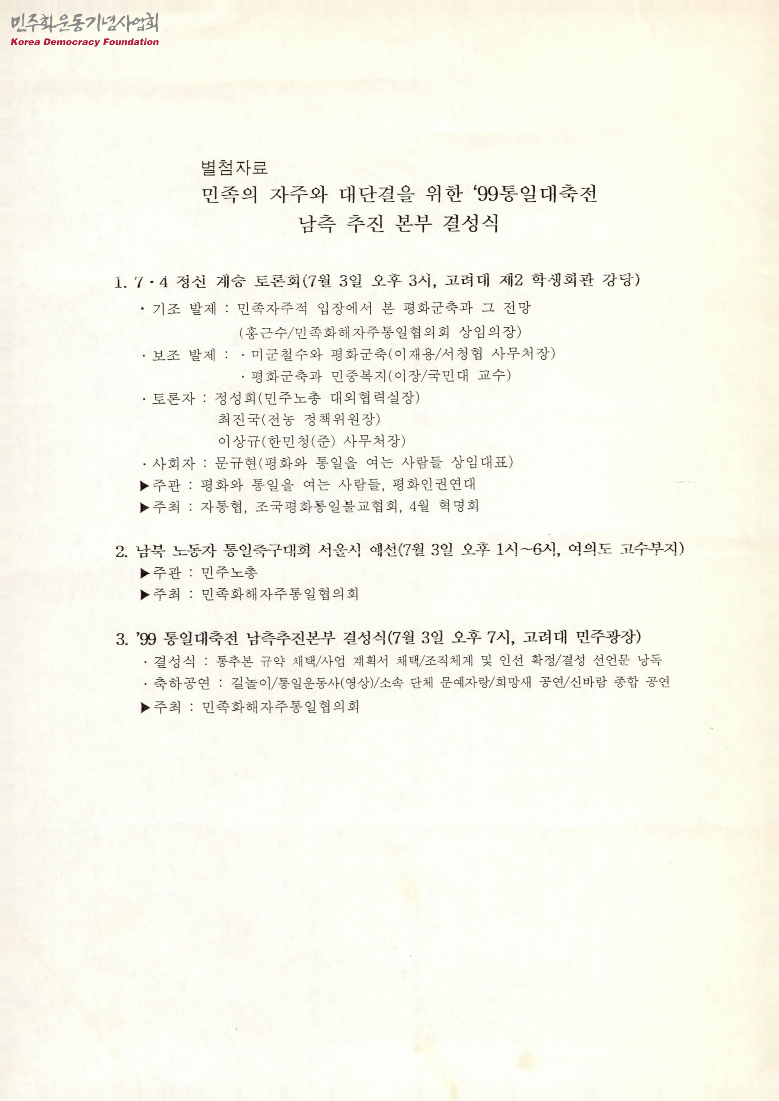 - 7.4 정신 계승 토론회의 발제와 토론자, 남북 노동자 통일축구대회 서울시 예선, 99 통일대축전 남측추진본부 결성식 등의 내용을 포함한 자료