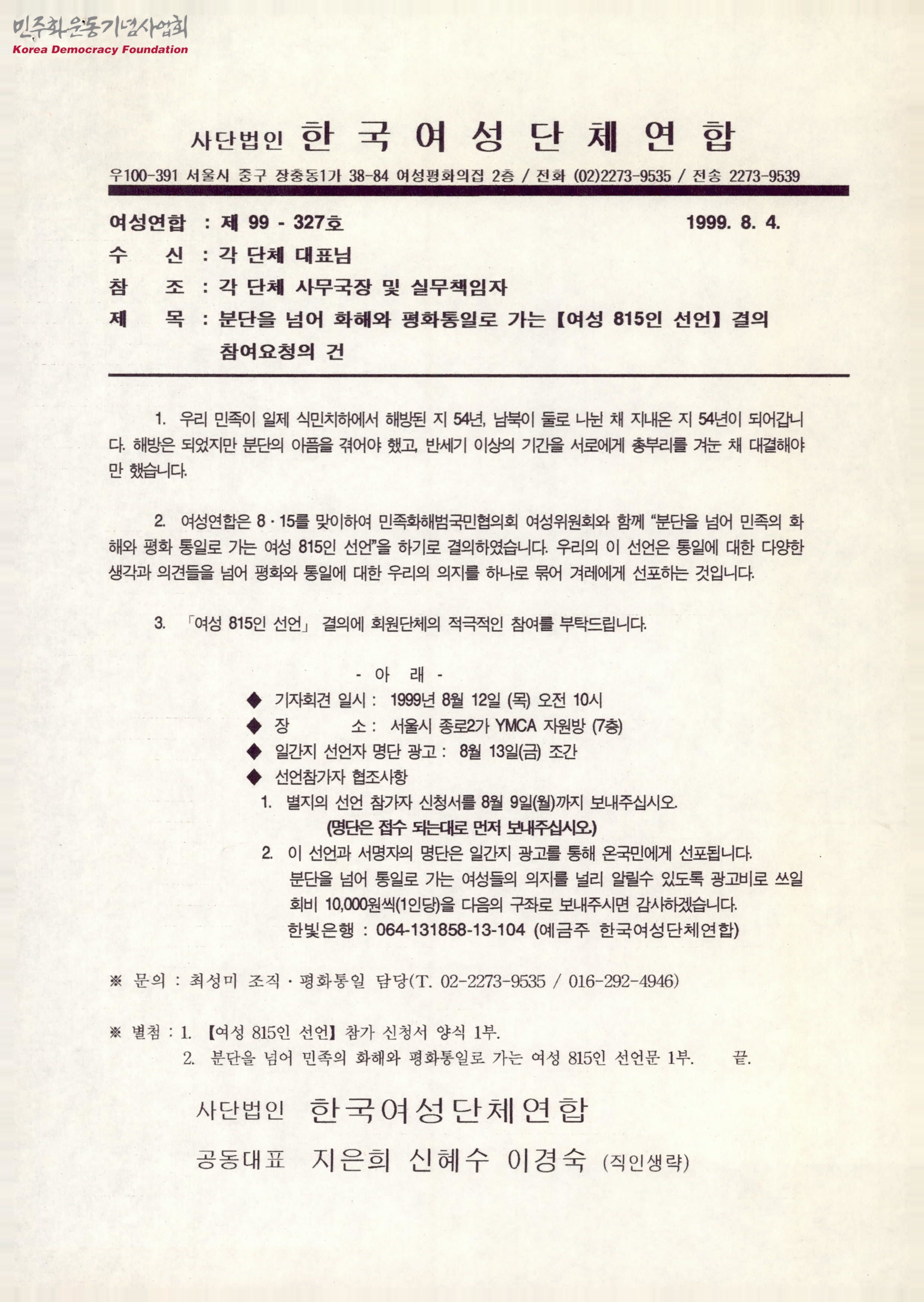 - 여성 815인 선언 결의에 회원단체의 적극적인 참여를 부탁하고 기자회견 일시와 장소, 분단을 넘어 민족의 화해와 평화 통일로 가는 여성 815인 선언문 등의 내용을 포함한 자료
