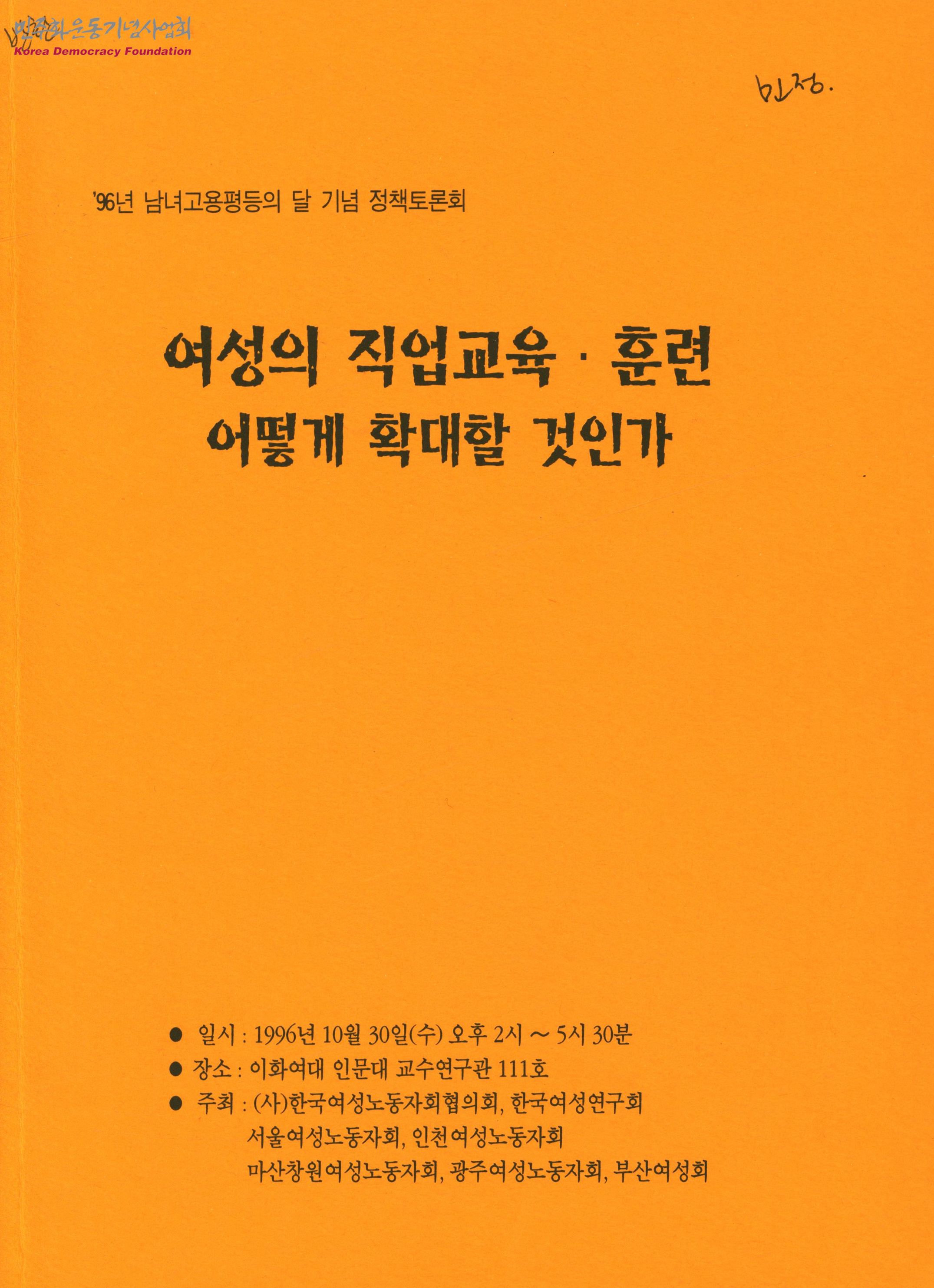 - 96년 남녀고용평등의 달 기념 정책토론회에서 발표한 성별직업분리 실태와 변화 추이, 여성의 직업교육·훈련 현황, 직업훈련 수료자의 취업실태, 여성 직업교육·훈련 확대를 위한 정책방안 등의 내용을 포함한 자료집