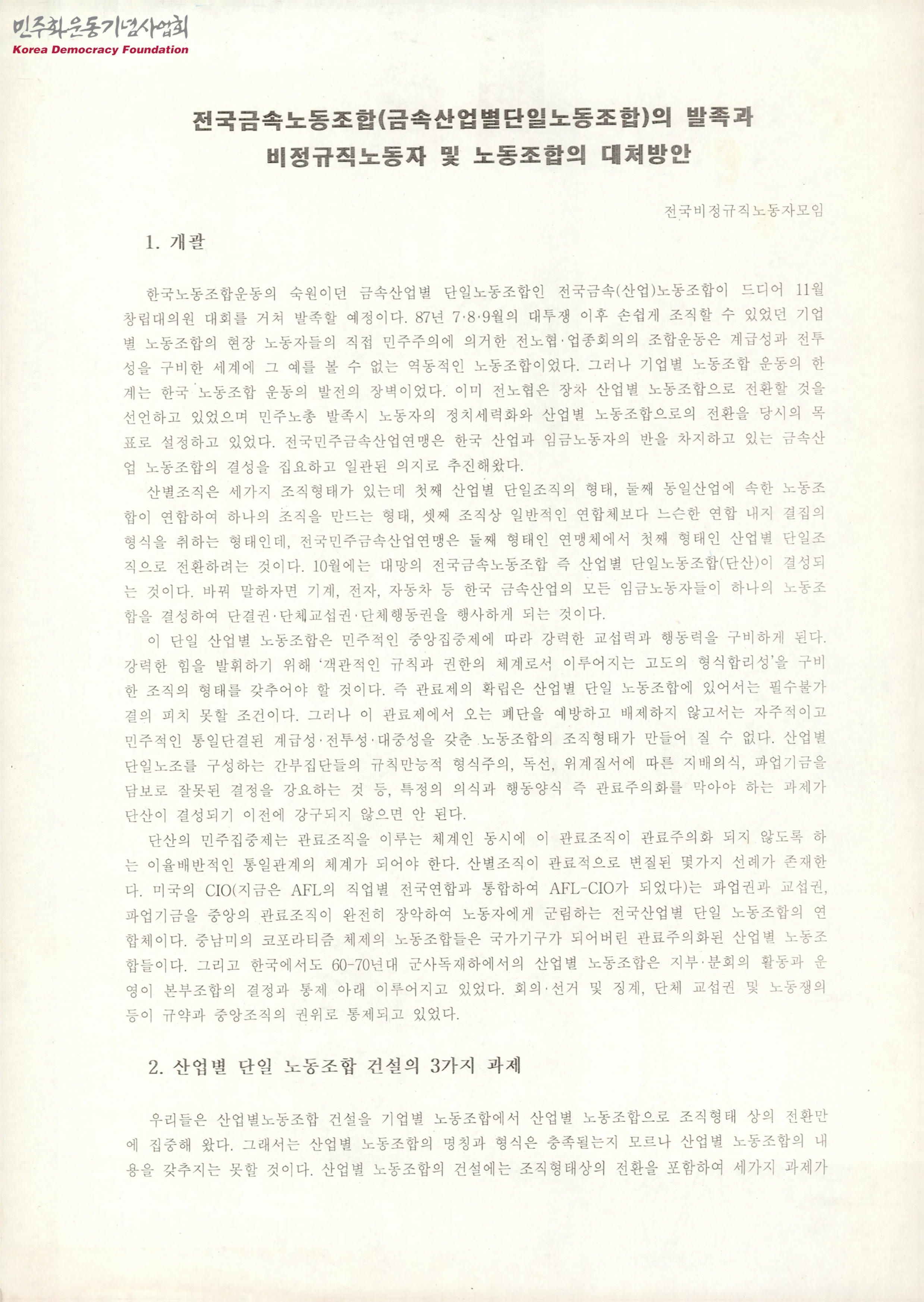 - 산업별 단일 노동조합 건설의 3가지 과제, 금속산업연맹은 비정규직 노동자를 어떻게 포괄(가입)해 낼 것인가, 비정규직 노동조합 및 노동자들의 금속산업노조 가입에 관한 몇가지 방안, 비정규직 차별철폐가 아닌 비정규노동제 철폐를 등의 내용을 포함