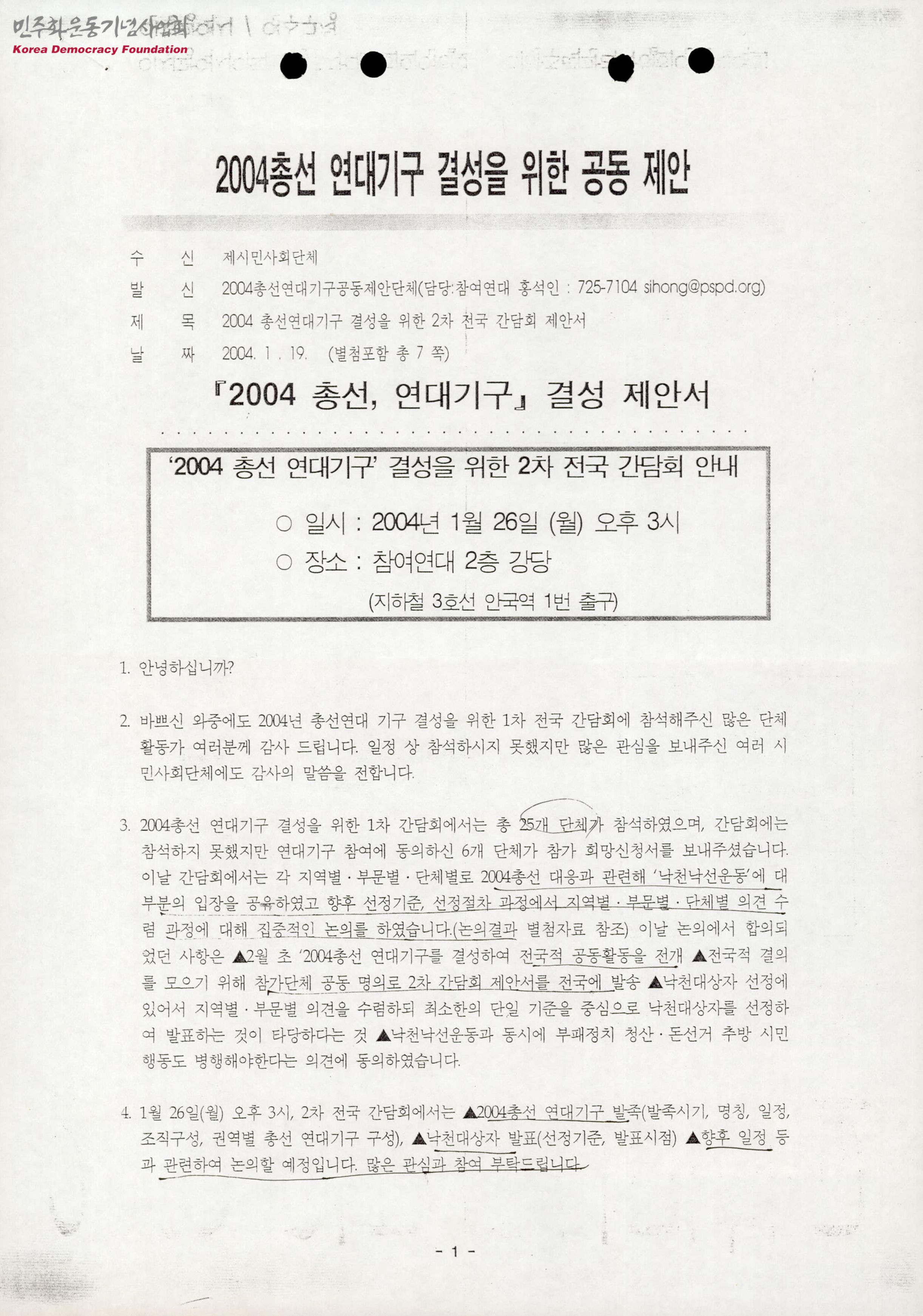 - 2004 총선 연대기구 결성을 위한 제안서 -별첨1. 2004총선 연대기구 결성을 위한 전국 간담회 회의결과 -별첨2. 2004총선 연대기구 참가희망 신청서