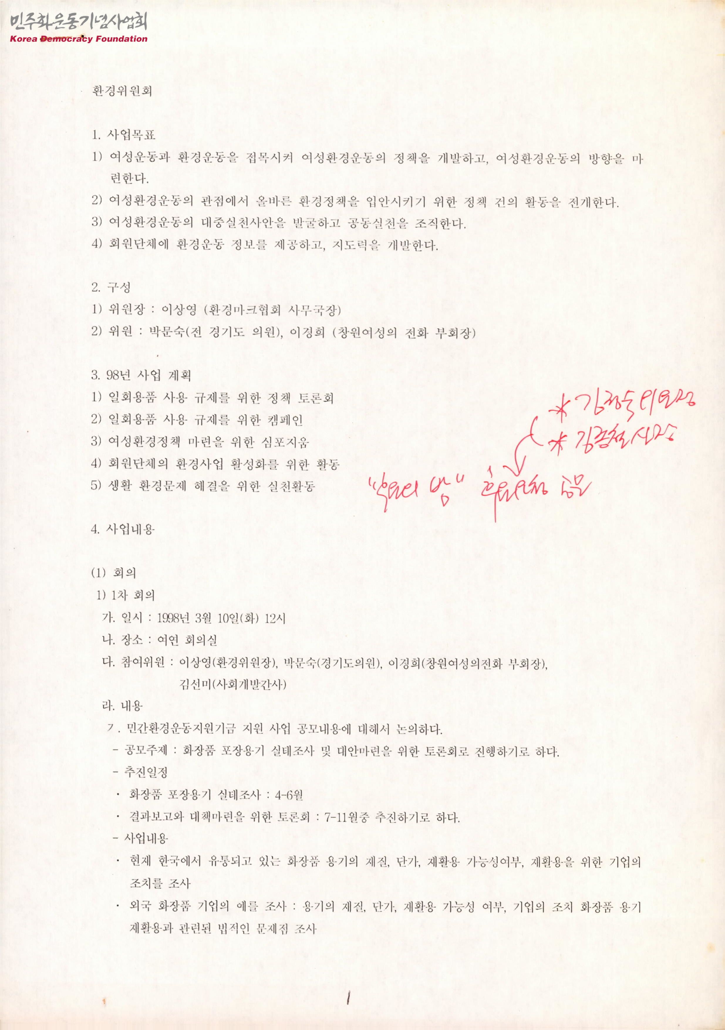 - 환경위원회 보고서, 14회 한국여성대회 및 여성문화마당 "힘모아 힘을 줘" 관련 여성권익사업, 실직여성가장돕기 캠페인 "희망" 관련 연대사업에 관한 내용이 수록되어 있는 사업보고서의 일부