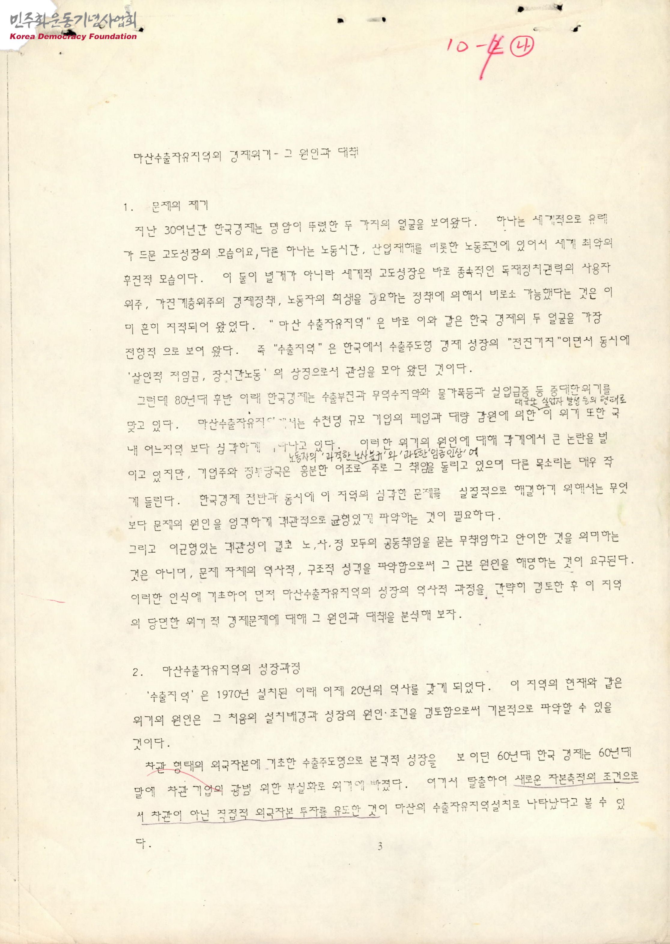 - 마산수출자유지역에 대한 문서로 성장과정, 경제위기와 지역경제에 미치는 영향, 원인, 대책을 다루고 있음 외자관계법 개정시안 및 감원, 폐업 방지를 위한 특별법 제정시안에 대한 검토, 한국 동경전파의 경우가 포함되어 있음