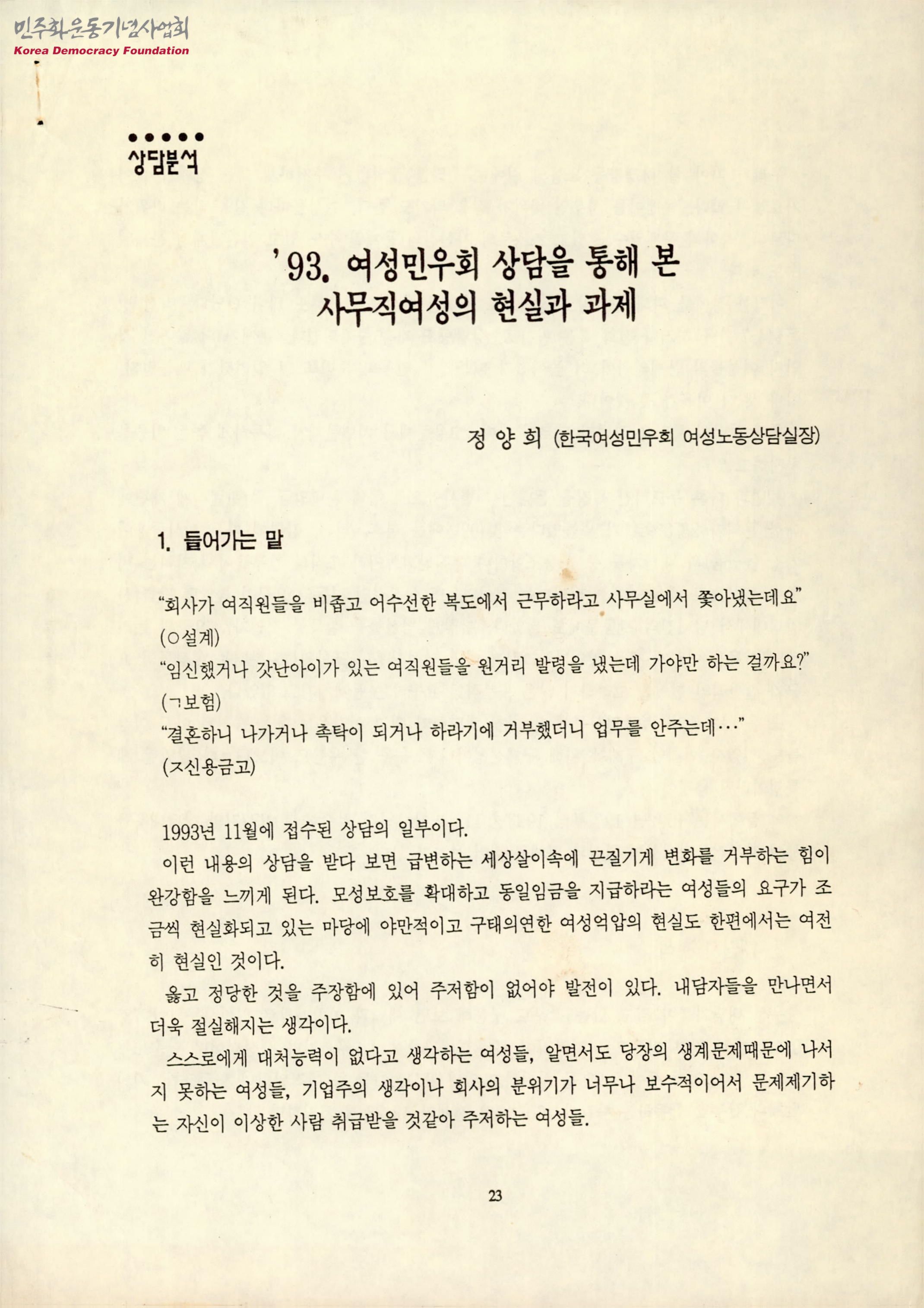 93. 여성민우회 상담을 통해 본 사무직여성의 현실과 과제