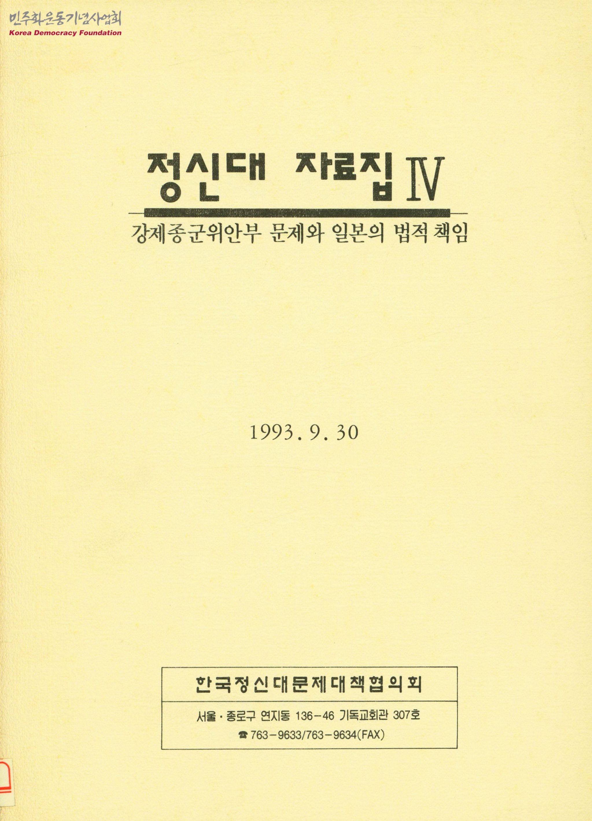 - 강제종군위안부 문제에 대한 기록사진, 활동일지, 주요성명서 및 서한, 신문보도자료 등을 포함한 자료집으로 목차는 다음과 같음 일본의 전쟁책임은 끝났는가? 강제종군위안부 문제에 대한 한.일 양정부 입장의 문제점 강제종군위안부 문제에 대한 일본의 책임이행 방안 중대한 인권침해의 희생자에 대한 배상 종군위안부, 강제연행문제와 유엔 종군위안부 인권침해에 대한 국제적 차원에서의 해결방안