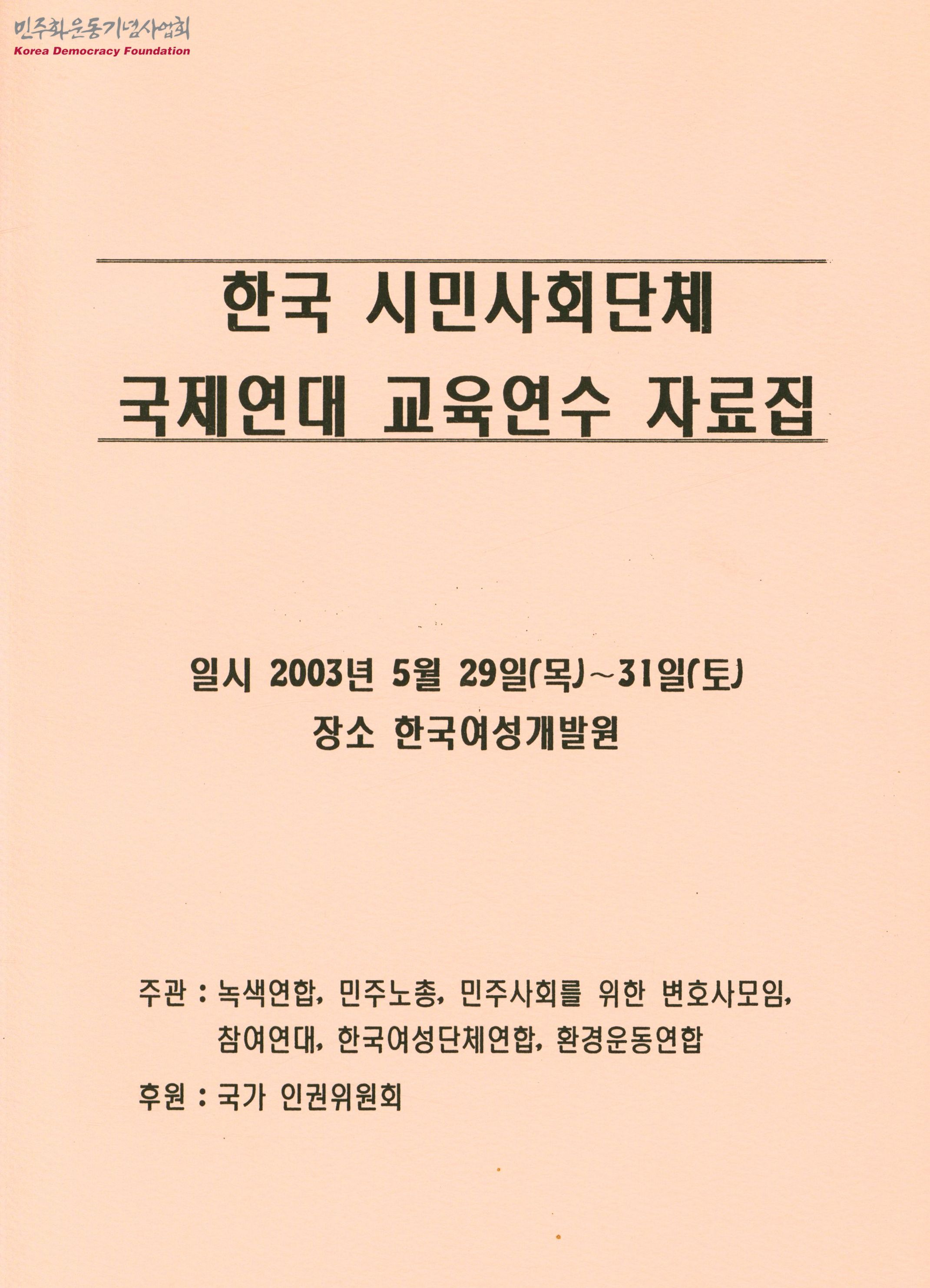 - 한국 10여개단체 20여명 대표단이 참석한 회의의 자료집으로 글로벌 가버넌스(Global Govemance)와 국제시민사회의 동향, 한국시민사회운동과 국제연대, 여성, 인권, 노동 등의 토론에 대한 내용이 포함됨