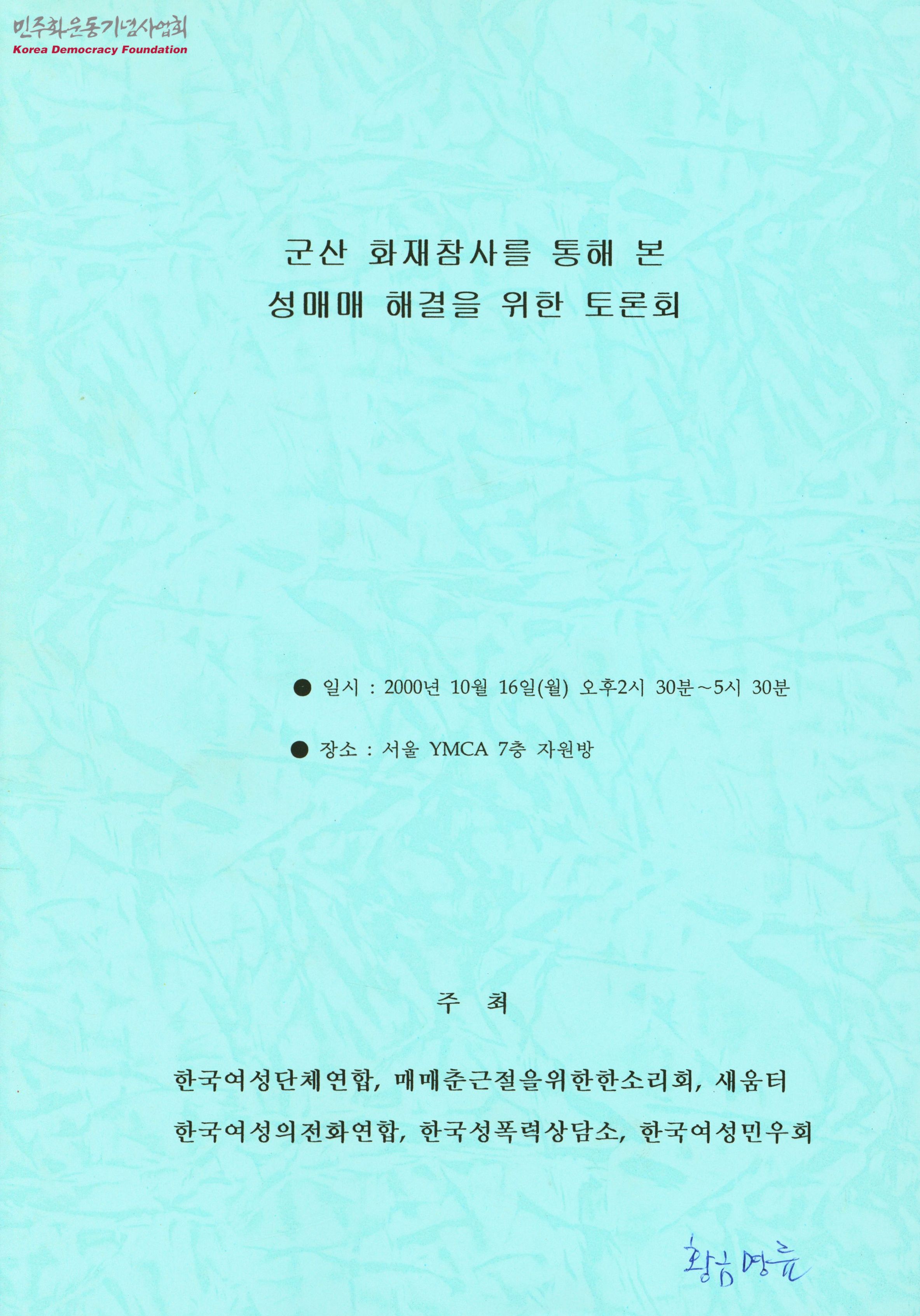 - 군산 화재 참사 사건 개요 및 경과와 성매매의 굴레, 우리 사회 성매매의 현실과 대책방안, 매매춘 문제의 대처방안, 성매매 근절 및 예방을 위한 제언 등의 내용이 포함된 자료집