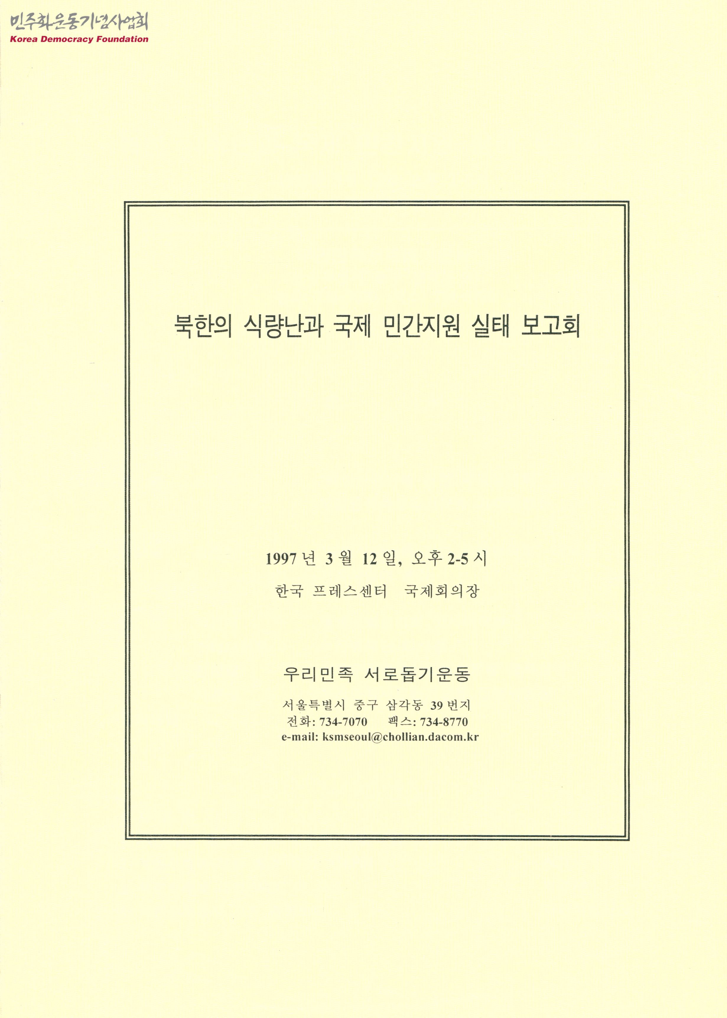- 보고회의 자료집으로 수록된 자료는 다음과 같음 1. FAO/WFP 특별보고서: 북한의 곡물/식량 공급상황 평가단 2. 북한수해에 대한 원조 요청 ASKP61 3. 북한수해에 대한 WCC의 지원 4. 북한수해물자 지원 종합보고