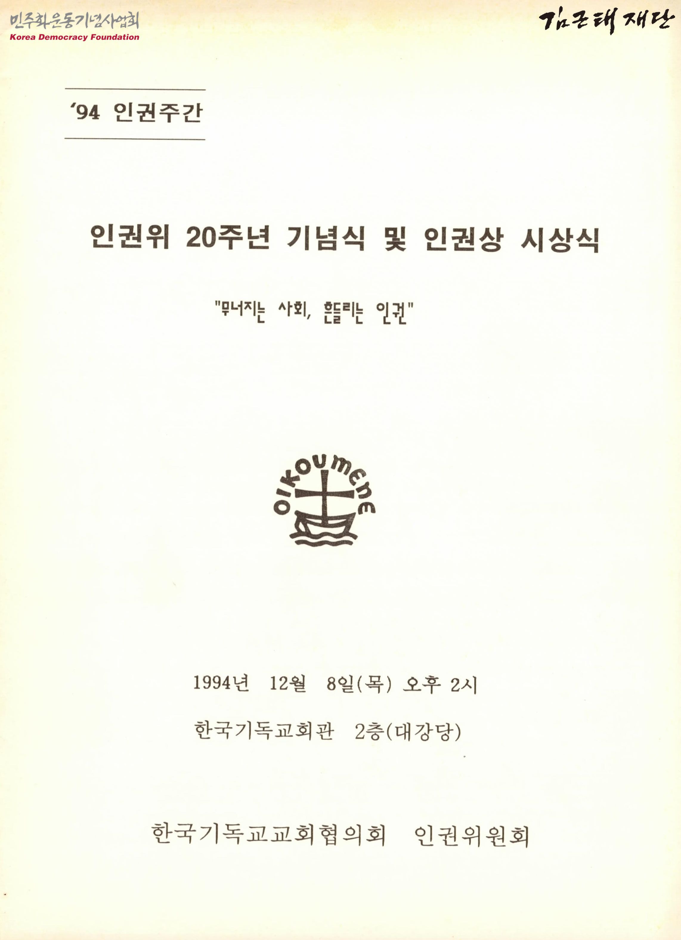 - 94년 인권주간을 맞이하여 열린 인권위 20주년 기념식 및 인권상 시상식의 행사순서와 시상사유, 수상자 소개, 수상단체소개, 찬송가, 94 인권선언 등의 내용 포함하고 있음