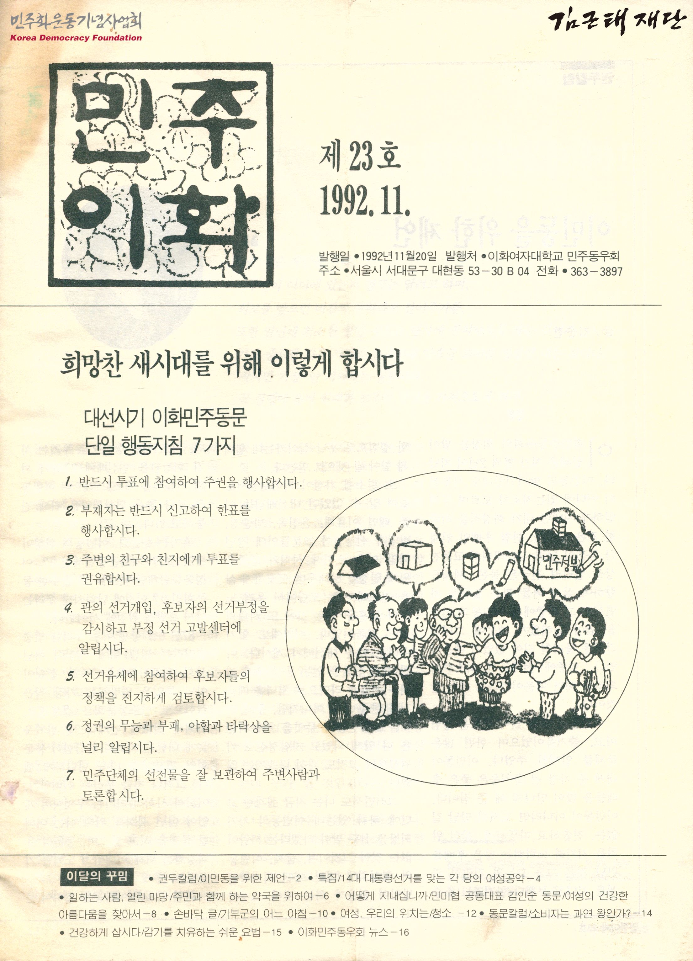 - 이민동을 위한 제언, 14대 대통령선거를 맞는 각 당의 여성공약, 주민과 함께 하는 약국을 위하여 등의 내용을 포함한 소식지