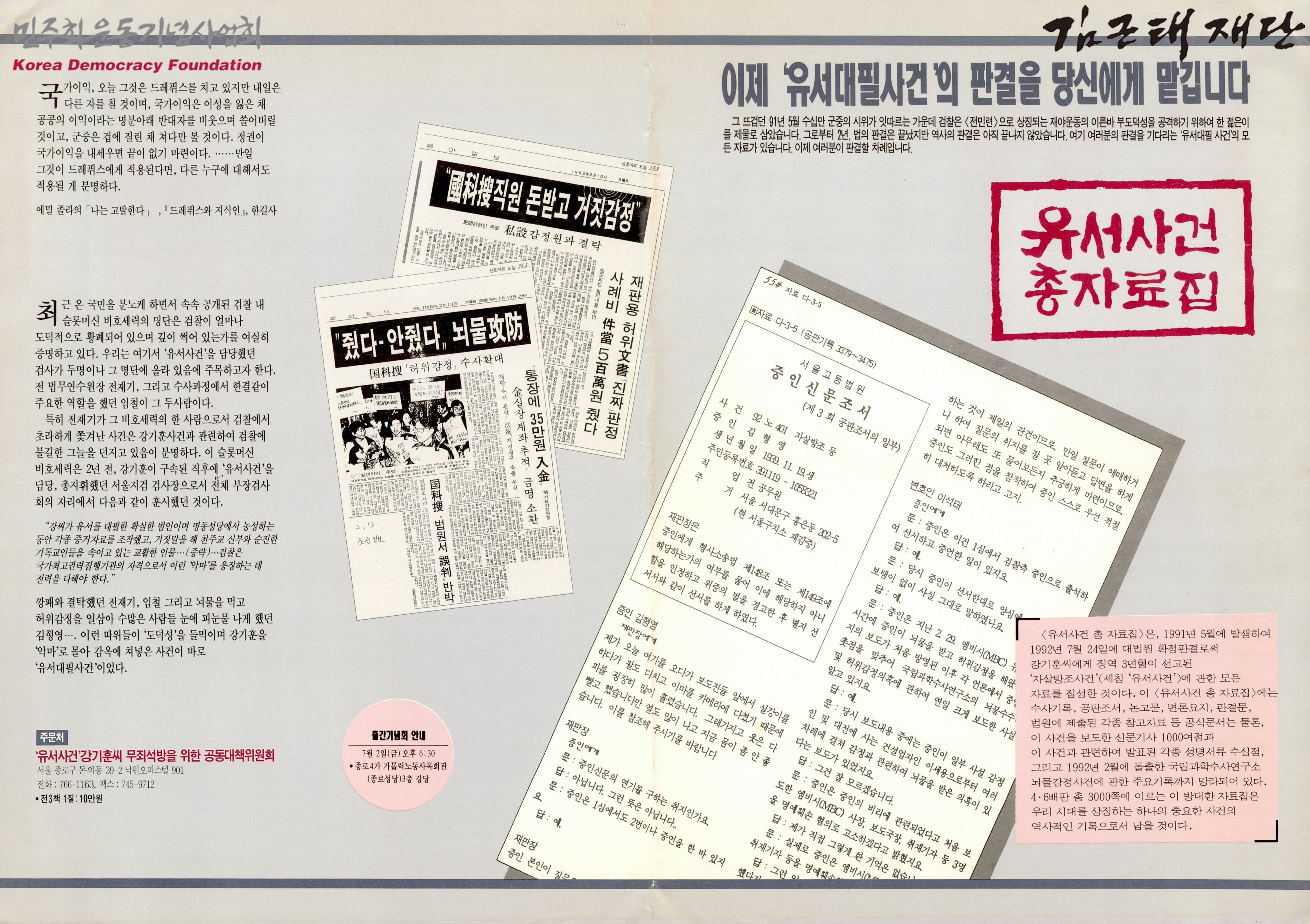 - 유서사건' 강기훈씨 무죄 석방을 위한 공동대책위원회에서 제작한 것으로 유서사건 총자료집의 발간을 홍보하기 위한 배포물