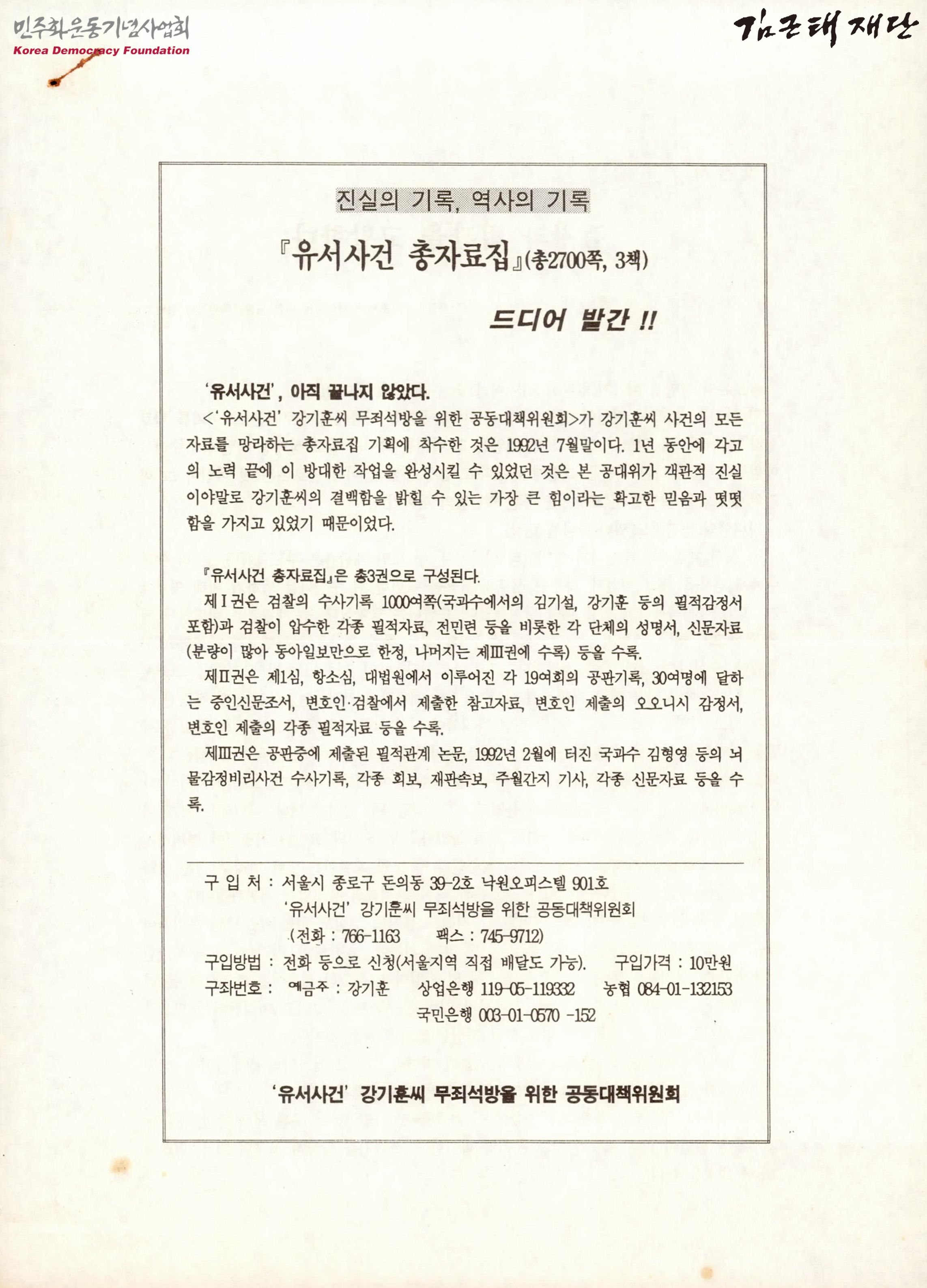 『유서사건 총자료집』(총2700쪽, 3책) 드디어 발간!