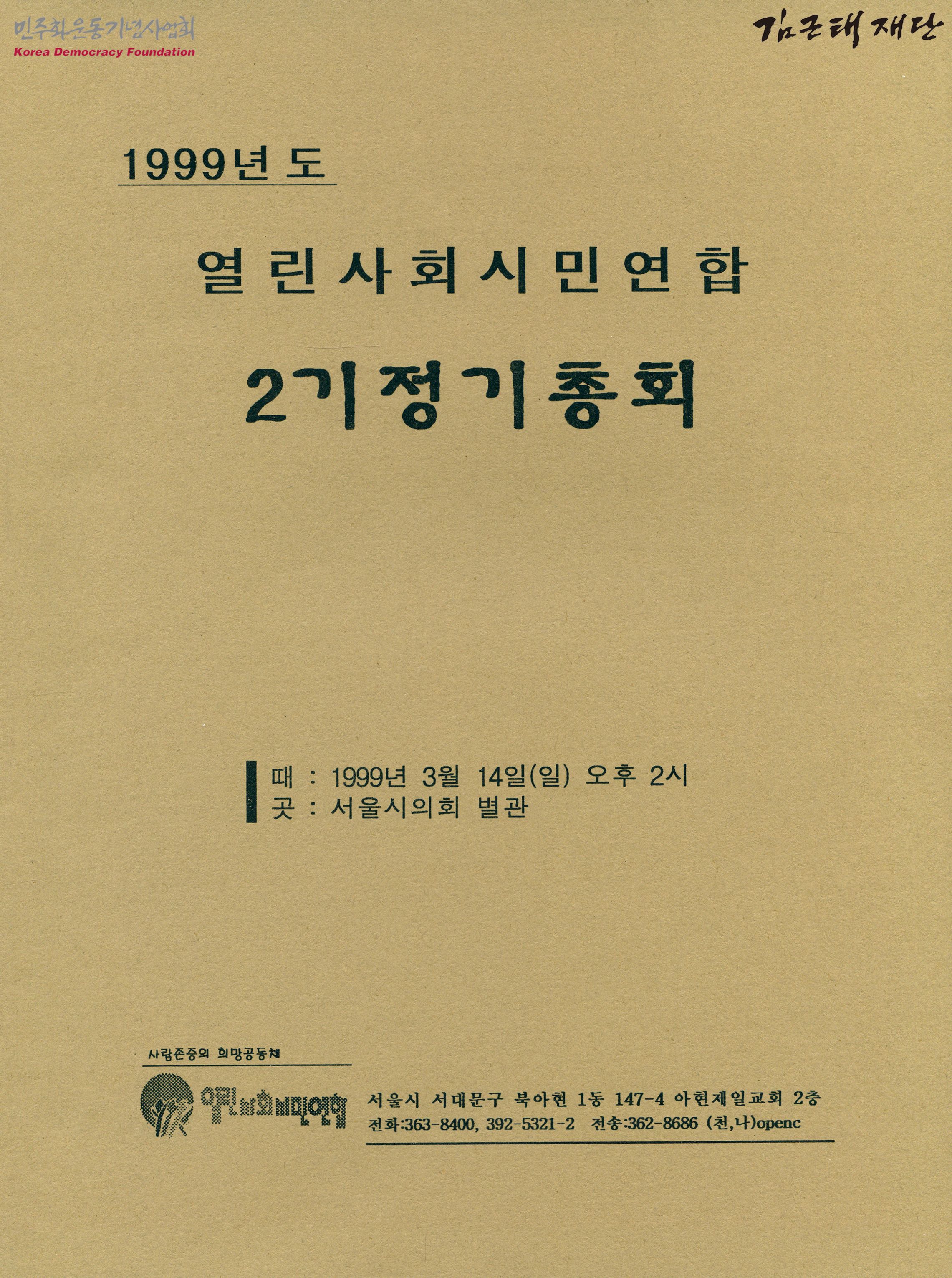 - 1999년 3월 14일에 열린 1999년도 열린사회시민연합의 2기정기총회 자료집으로 식순, 대회사, 열린사회시민연합 1기 사업보고, 회기 감사보고, 중심 사업 과제 해설 등의 내용을 포함하고 있음
