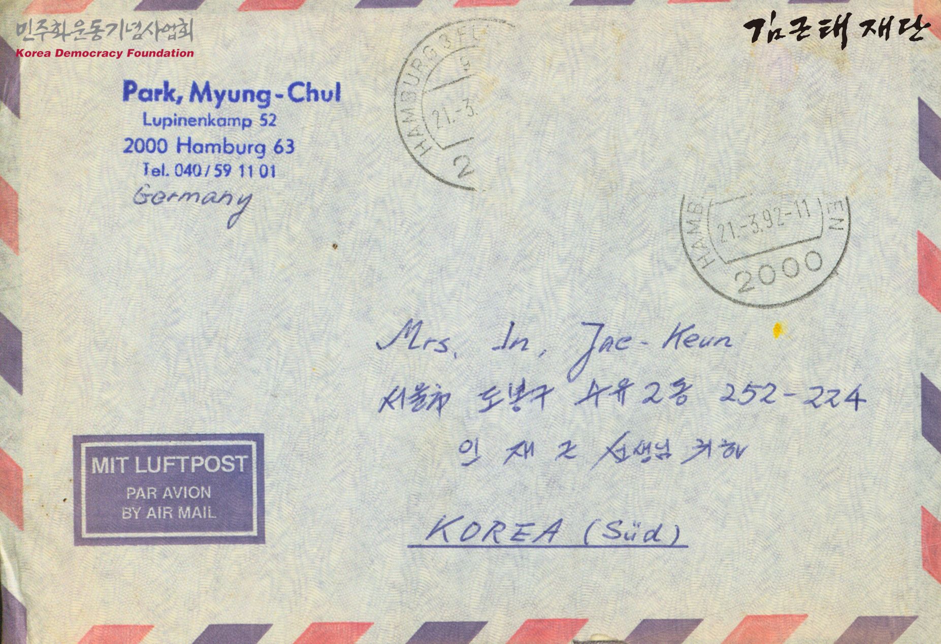 - 독일에서 박명철이 인재근에게 보낸 편지로 독일 함부르크에서 민가협 식구들과 만나 한국인권 침해 강연회 겸 보고회를 가진 것 등의 내용을 포함하고 있음
