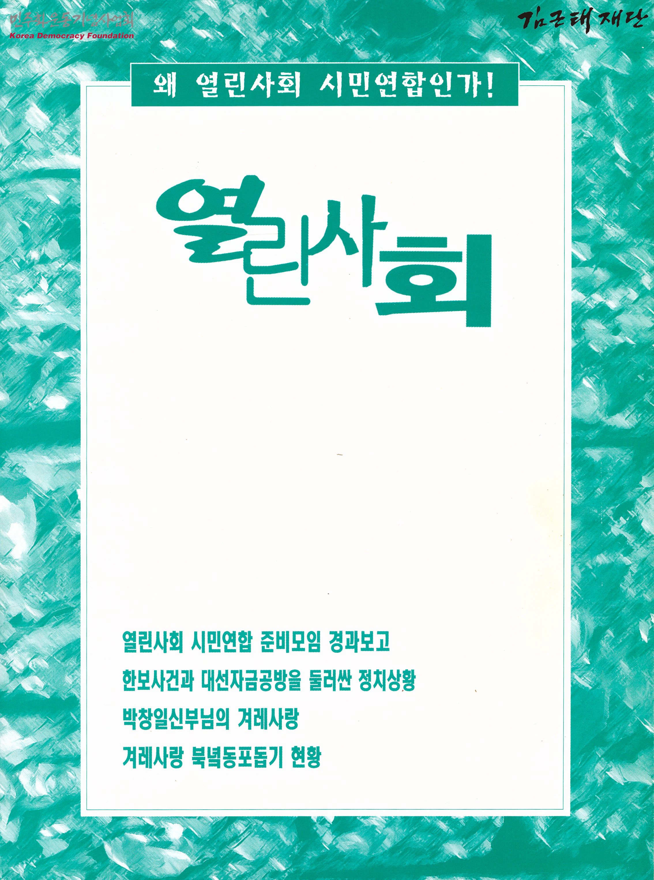 - 열린사회 창간호로, 열린사회 시민연합 준비모임 경과보고, 한보사건과 대선자금공방을 둘러싼 정치상황, 박창일신부님의 겨레사랑, 겨레사랑 북녘동포돕기 현황 등의 내용이 수록되어 있음