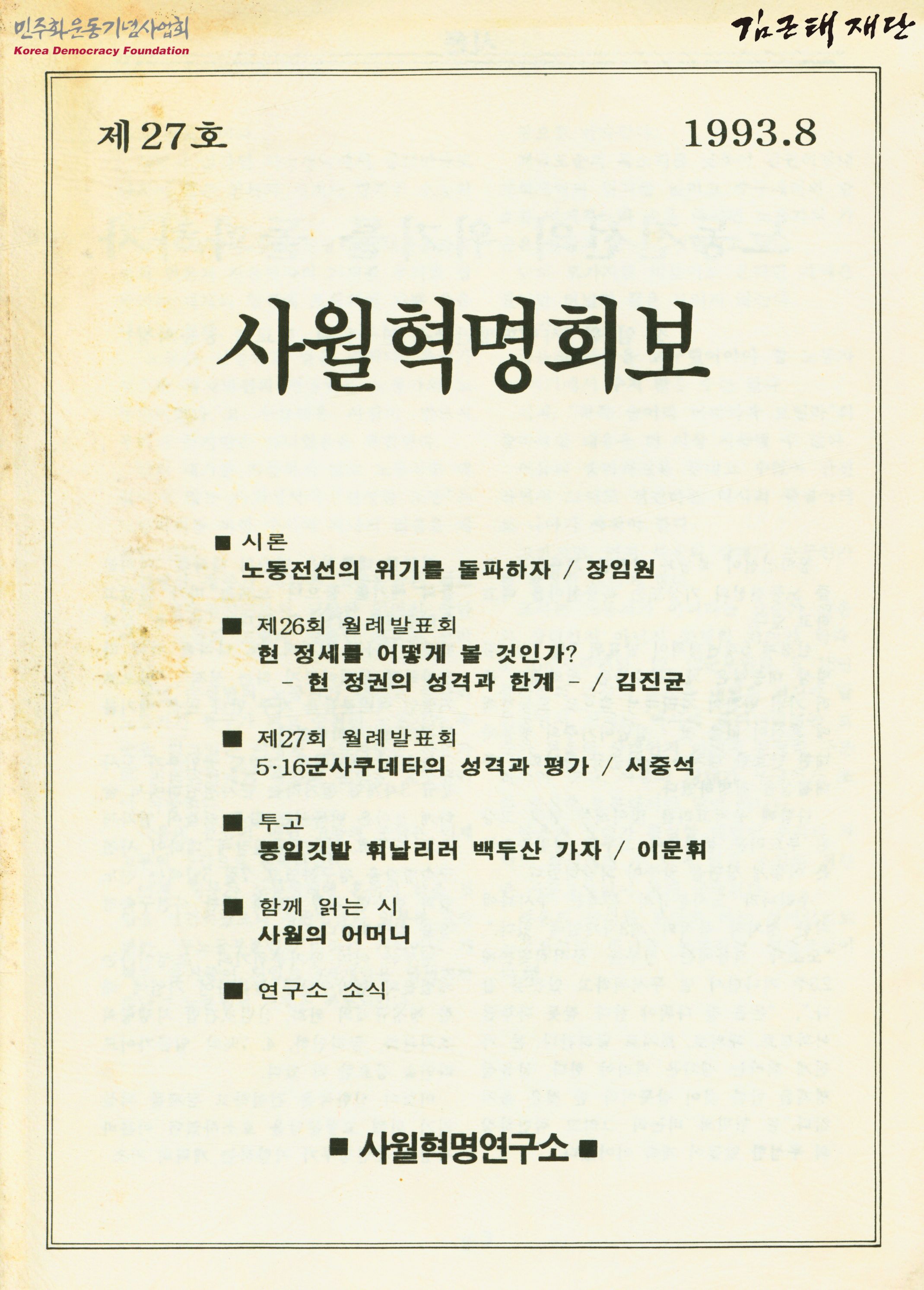 - 노동전선의 위기를 돌파하자, 제26회 월례발표회 : 현 정세를 어떻게 볼 것인가?-현 정권의 성격과 한계, 제27회 월례발표회 : 5·16군사쿠테타의 성격과 평가 등의 내용을 포함하고 있는 간행물