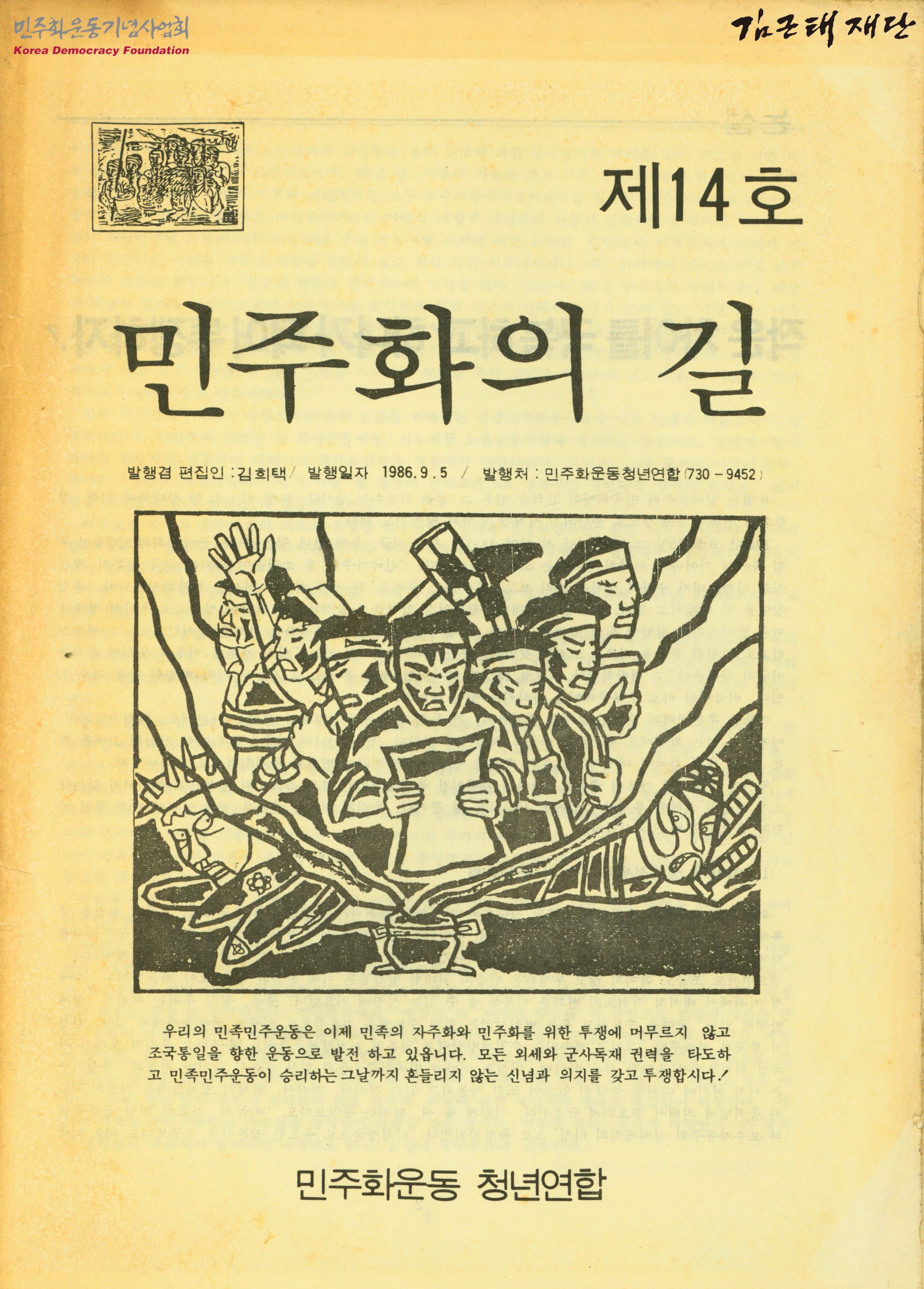 - 민주화의 길 14호로, 다음의 차례로 구성되어 있음 논설 - 작은 차이를 극복하고 하나가 되어 투쟁하자! 정세분석 - 위기의 심화와 집권세력의 대응 특집 - '86상반기 민족민주운동의 새로운 전개 운동론시리즈 - 민족민주운동과 노동운동의 자주성 시론 - 개헌과 아시안 게임 '86년 상반기 민주민주운동 일지
