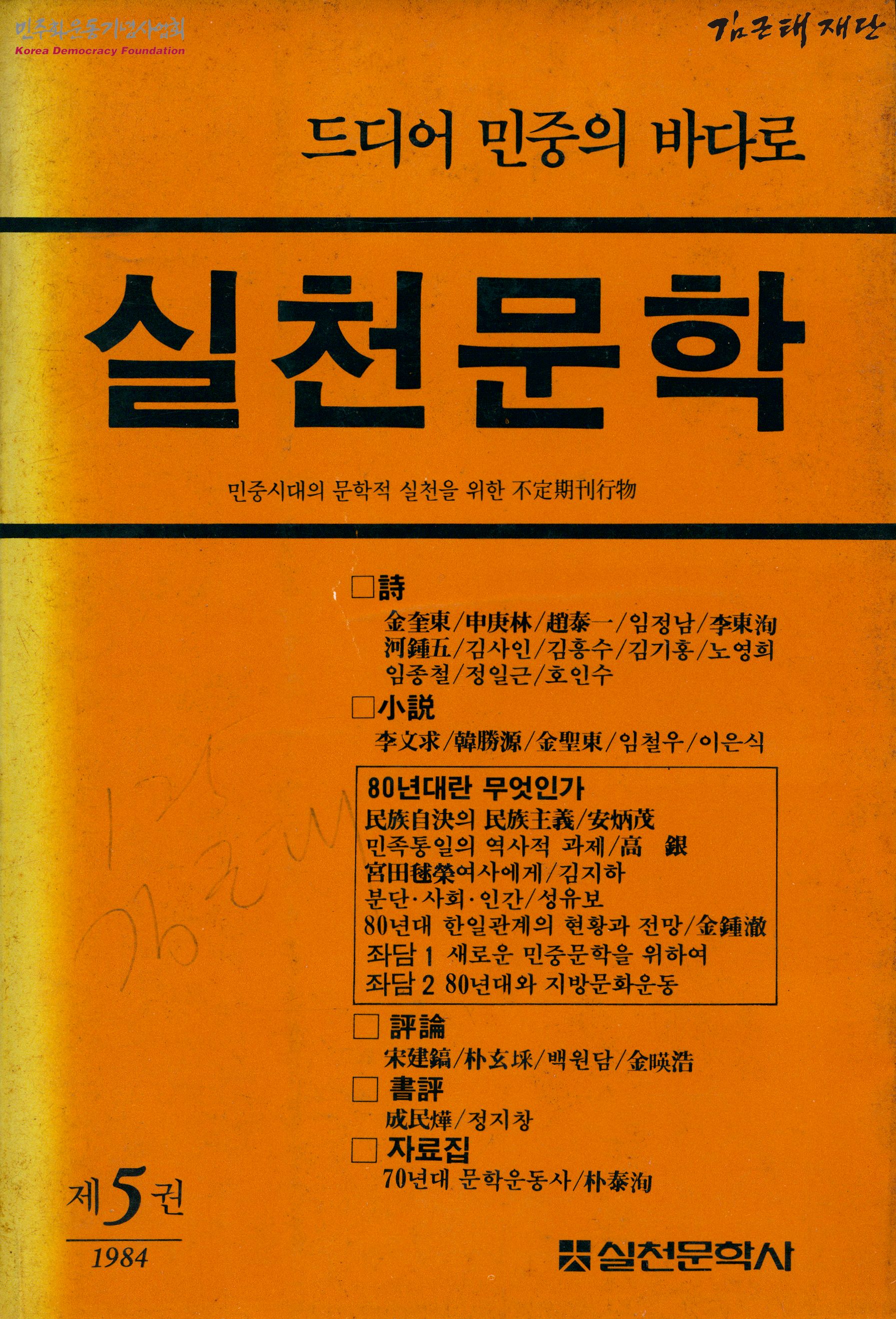 - 민중의 새시대문학운동을 실천하는 부정기간행물로 차례는 다음과 같음 시 소설 80년대란 무엇인가 평론 서평 자료집