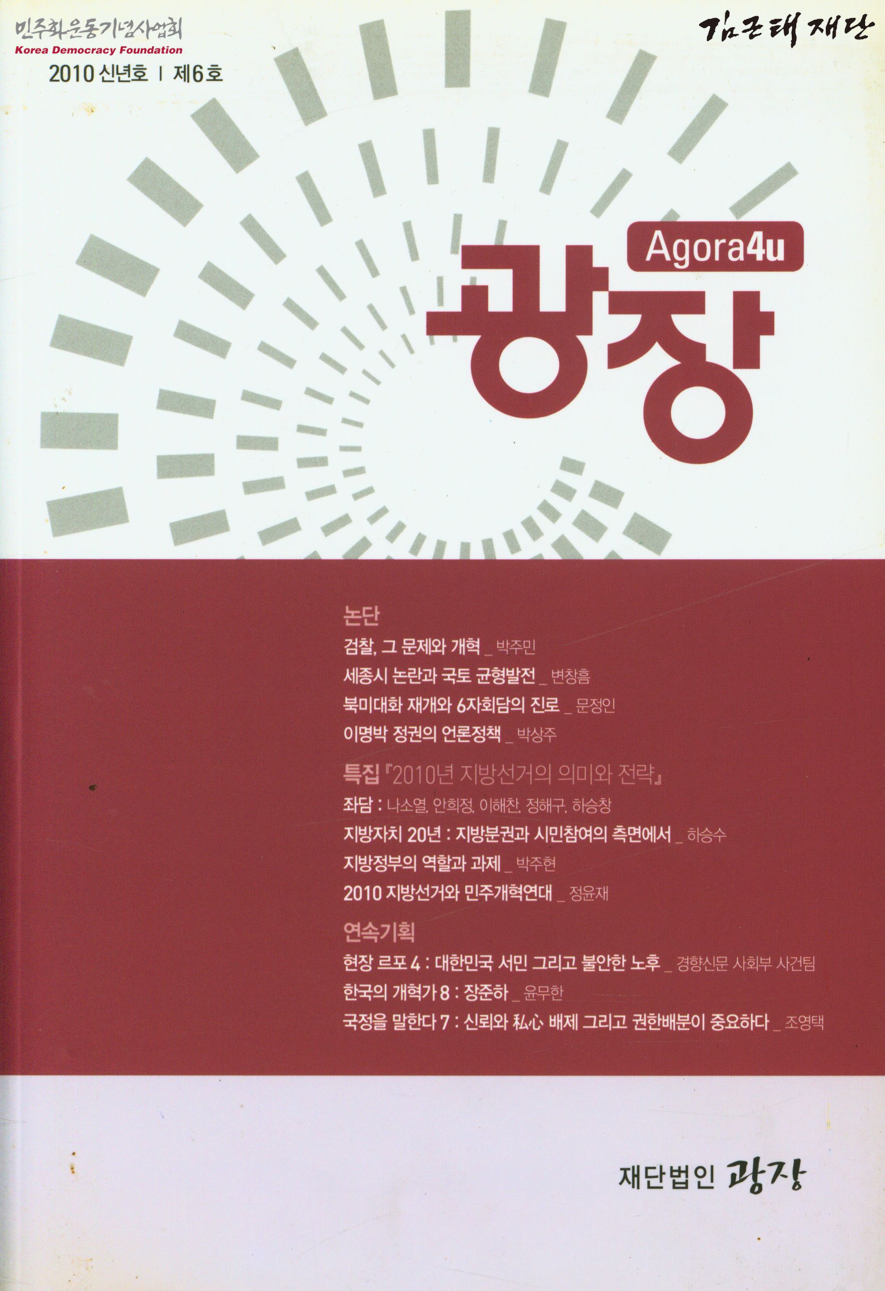 - 재단법인 광장의 소식지로 차례는 다음과 같음 논단 검찰, 그 문제와 개혁 세종시 논란과 국토 균형발전 북미대화 재개와 6자회담의 진로 이명박 정권의 언론정책 특집 『2010년 지방선거의 의미와 전략』 좌담 지방자치 20년-지방분권과 시민참여의 측면 에서 지방정부의 역할과 과제 연속기획 현장 르포4:대한민국 서민, 그리고 불안한 노후 한국의 개혁가 8 장준하 국정을 말한다-신뢰와 상심 배제 그리고 권한배분이 중요하다