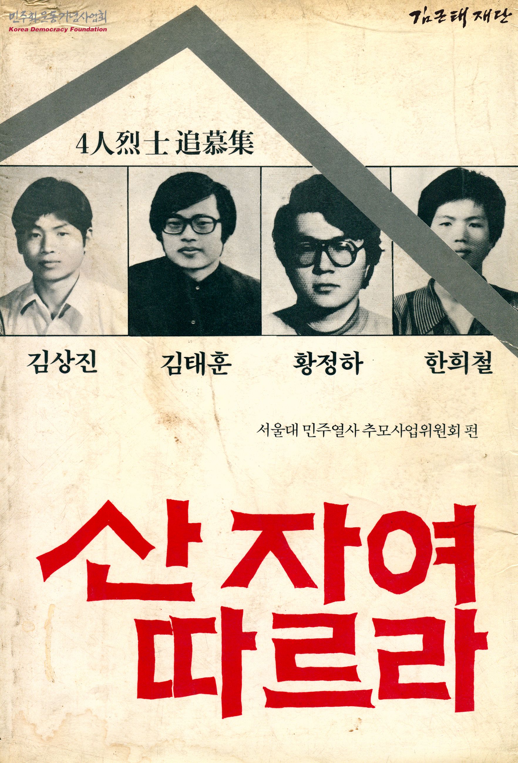 - 서울대 민주열사 4인 김상진, 김태훈, 황정하, 한희철의 유고와 주변인들의 추모글들을 모아 엮은 추도집으로 다음의 목차로 구성되어 있음 서시 추도사 Ⅰ. 김상진 열사 시 / 김상진 1. 어둠속의 불꽃 2. 무너지고 또 무너져도 3. 숭고한 피를 흩뿌려 4. 내 영혼에 눈이 뜨여 5. 다시 본 열사의 모습 Ⅱ. 김태훈 열사 추모사 시 : 季春閑談 1. 김태훈형의 삶과 죽음 2. 이것이 내 삶의 전부이기를 3. 나의 목숨을 한 알의 밀알로 4. 친구들의 추모글 Ⅲ. 황정하 열사 시 : 산꼭대기에 오르기 위하여 1. 바른글을 써라 2. 깨진듯이 외쳐라 3. 민족의 생존과 번영을 위한 민주화 투쟁선언 4. 11ㆍ8 민주화 시위와 황정하 5. 누가 정하형을 죽였는가 6. 민주투사 황정하의 희생을 통곡하면서 Ⅳ. 한희철 열사 추도사 1. 한희철의 삶과 죽음 2. 유고 모음