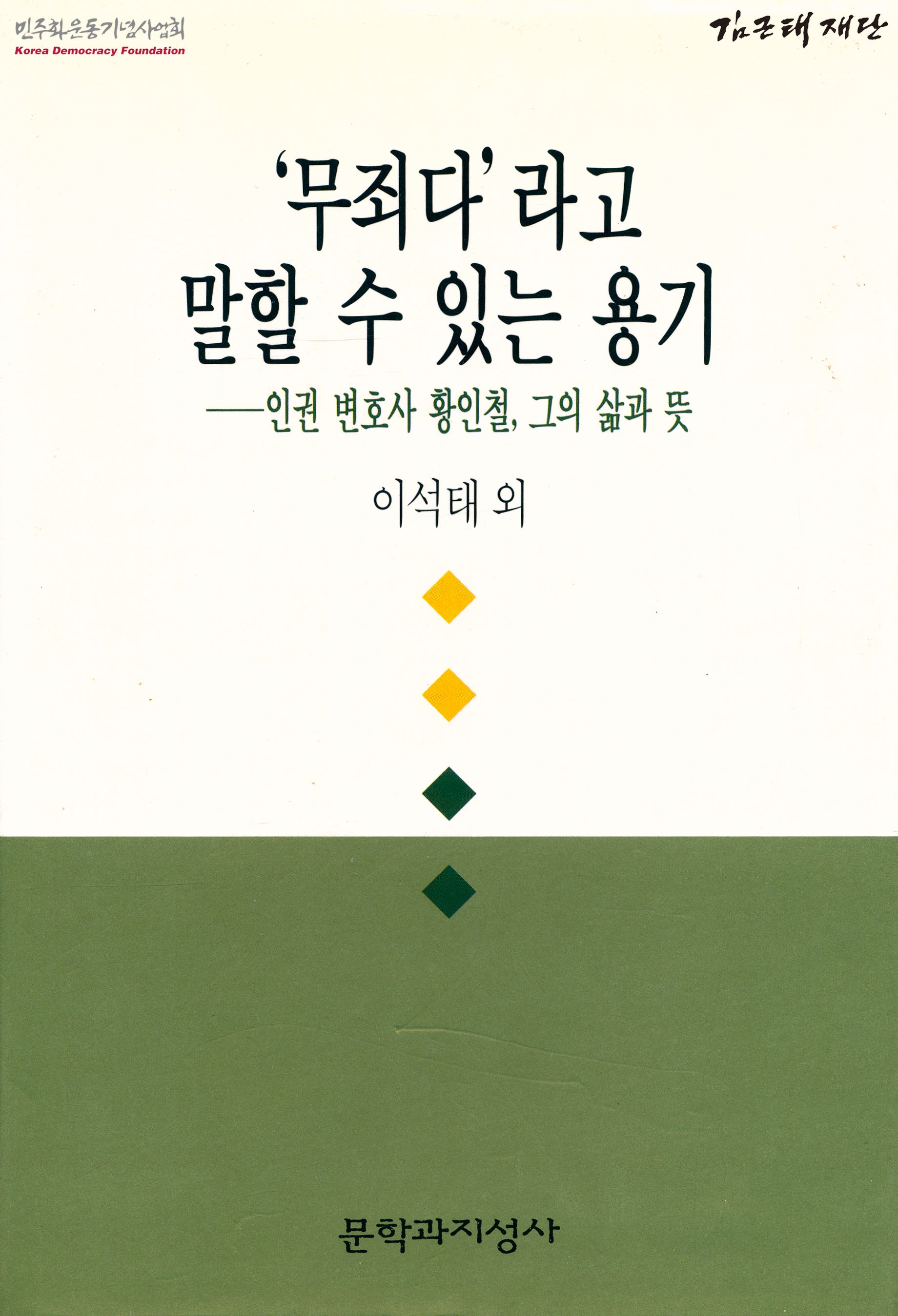 - 민주사회를 위한 변호사모임 창립 10주년을 맞아 기획한 황인철 평전으로, 민변과 천주교인권위원회, 문학과지성사의 합작으로 제작됨. 다음의 목차로 구성되어 있음. 책머리에/이석태 제1장 어린 시절 제2장 젊은 법학도 제3장 법률가의 길 제4장 독재와의 항쟁 속으로 제5장 문학과지성, 그 영혼의 쉼터에서 제6장 인권과 민주화를 위하여 제7장 귀의와 헌신 제8장 대립과 갈등을 넘어서 제9장 의에 순하다 부록 - 황인철 유고 황인철 연보 글쓴이 소개