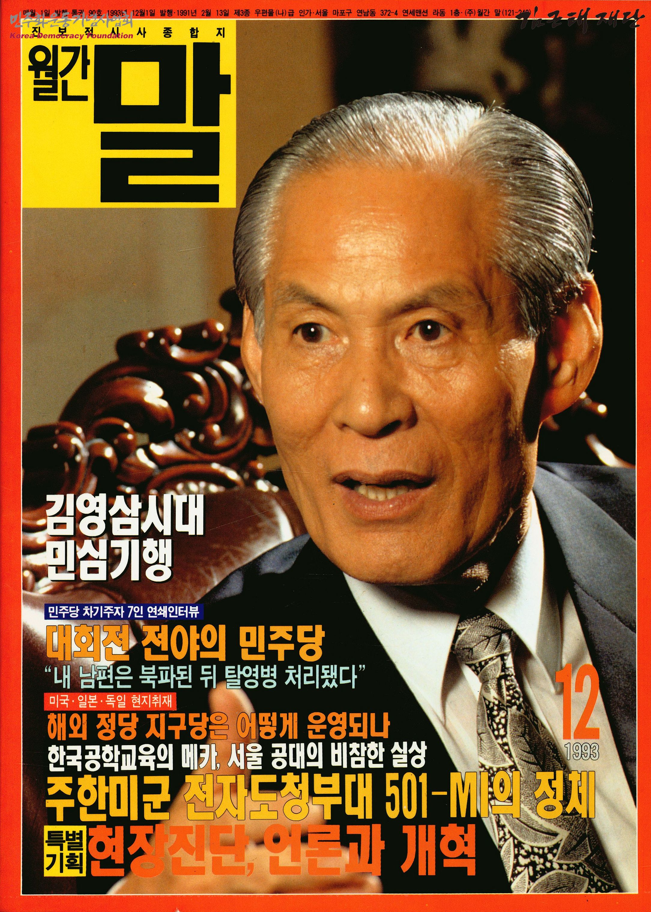 - 진보적 시사종합지 월간 말 1993년 12월호로 민주당 차기주자 7인 연쇄인터뷰 주한미군 전자도청부대501-MI의 정체 기지촌 생활 25년 김연자씨의 본격증언-내가 겪은 양공주, 미군범죄의 세계 양심수 가족들의 겨울나기 달라진 대학가의 대자보문화 풍속도 만국 오페라의 슬픈 아리아 등의 내용을 포함하고 있음