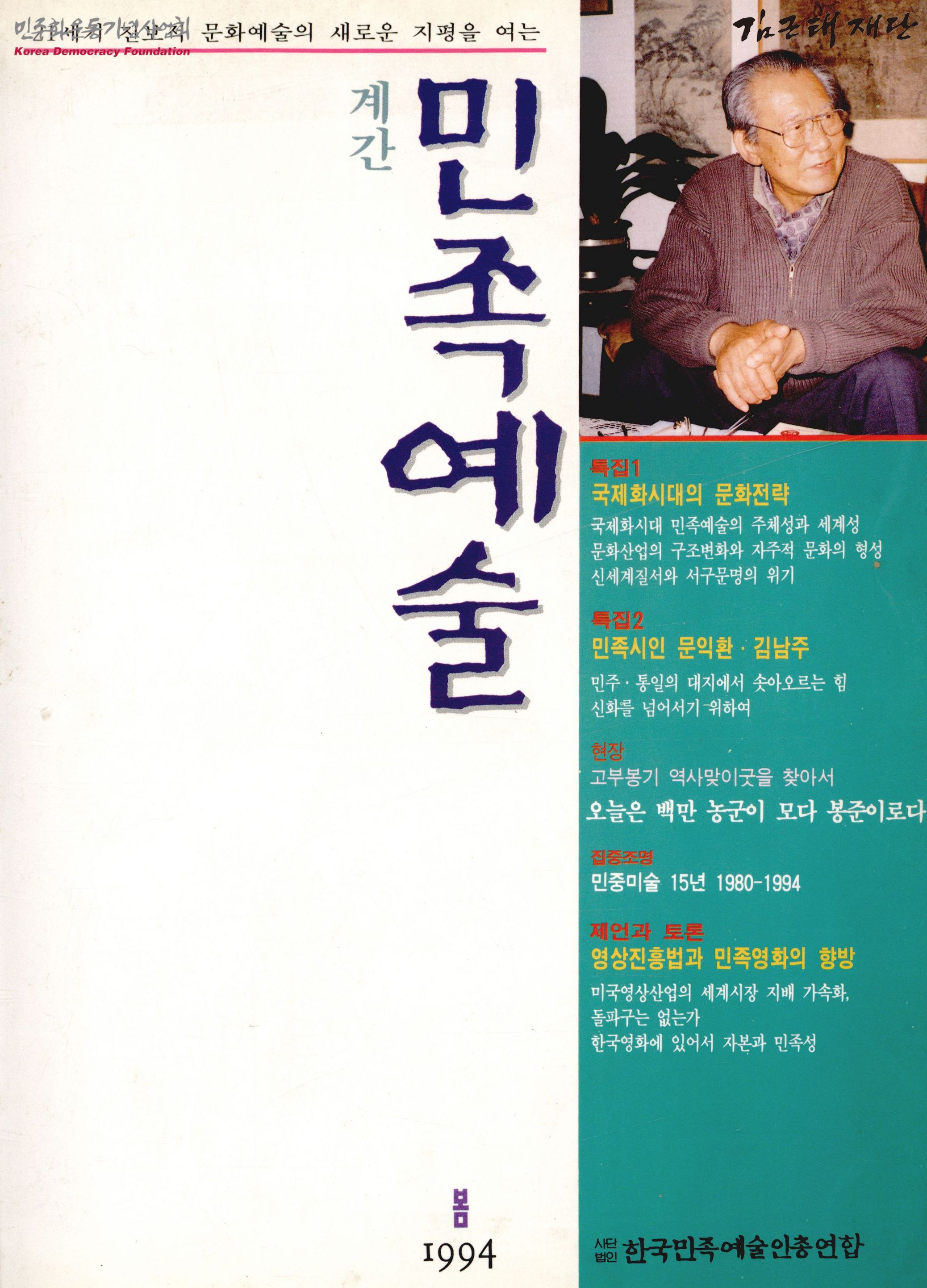 - 계간 민족예술의 1994년 봄호로 특집1-국제화시대의 문화전략 특집2-민족시인 문익환·김남주 현장-고부봉기 역사맞이굿을 찾아서 집중조명-민중미술 15년 1980-1994 제언과 토론-영상진흥법과 민족영화의 향방 등의 내용을 포함하고 있음