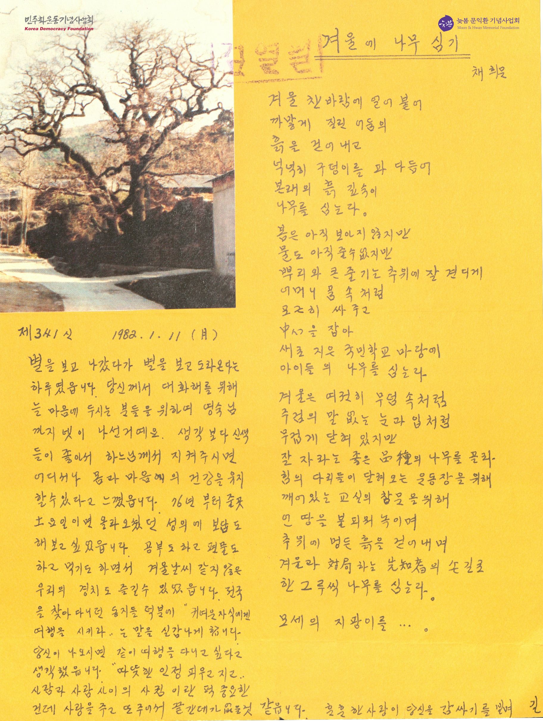 - 박용길 장로가 문익환 목사에게 별을 보면서 그를 생각하는 마음을 적어 보낸 서신. 채희은이 지은 시 '겨울에 나무 심기'와 겨울에 찍은 나무 사진이 첨부되어 있음