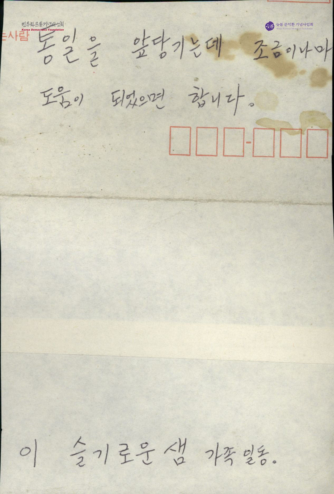- 슬기로운 샘 가족 일동이 박용길 장로에게 '통일을 앞당기는데 조금이나마 도움이 되었으면 합니다.'라고 적어 보낸 서신. 봉투에 내용이 적혀 있음