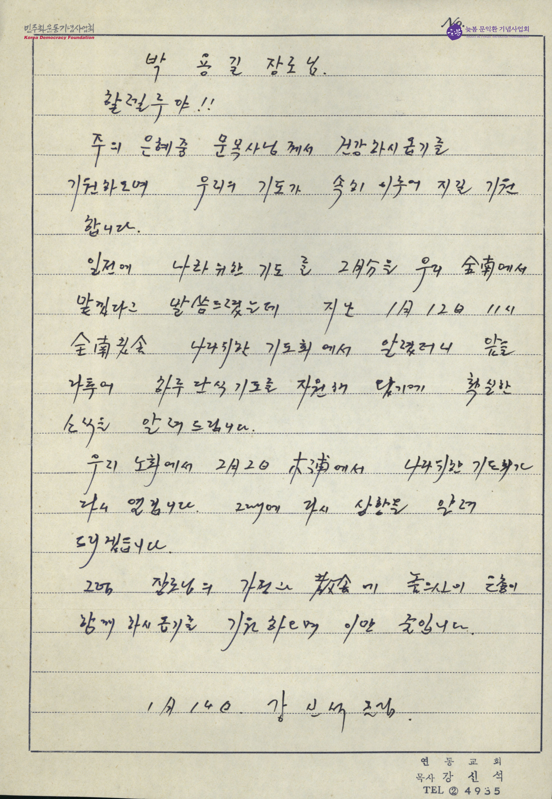 - 강신석이 박용길 장로에게 나라 위한 기도회의 소식을 전하고 추후 상황을 다시 알려준다는 내용을 적어 보낸 서신