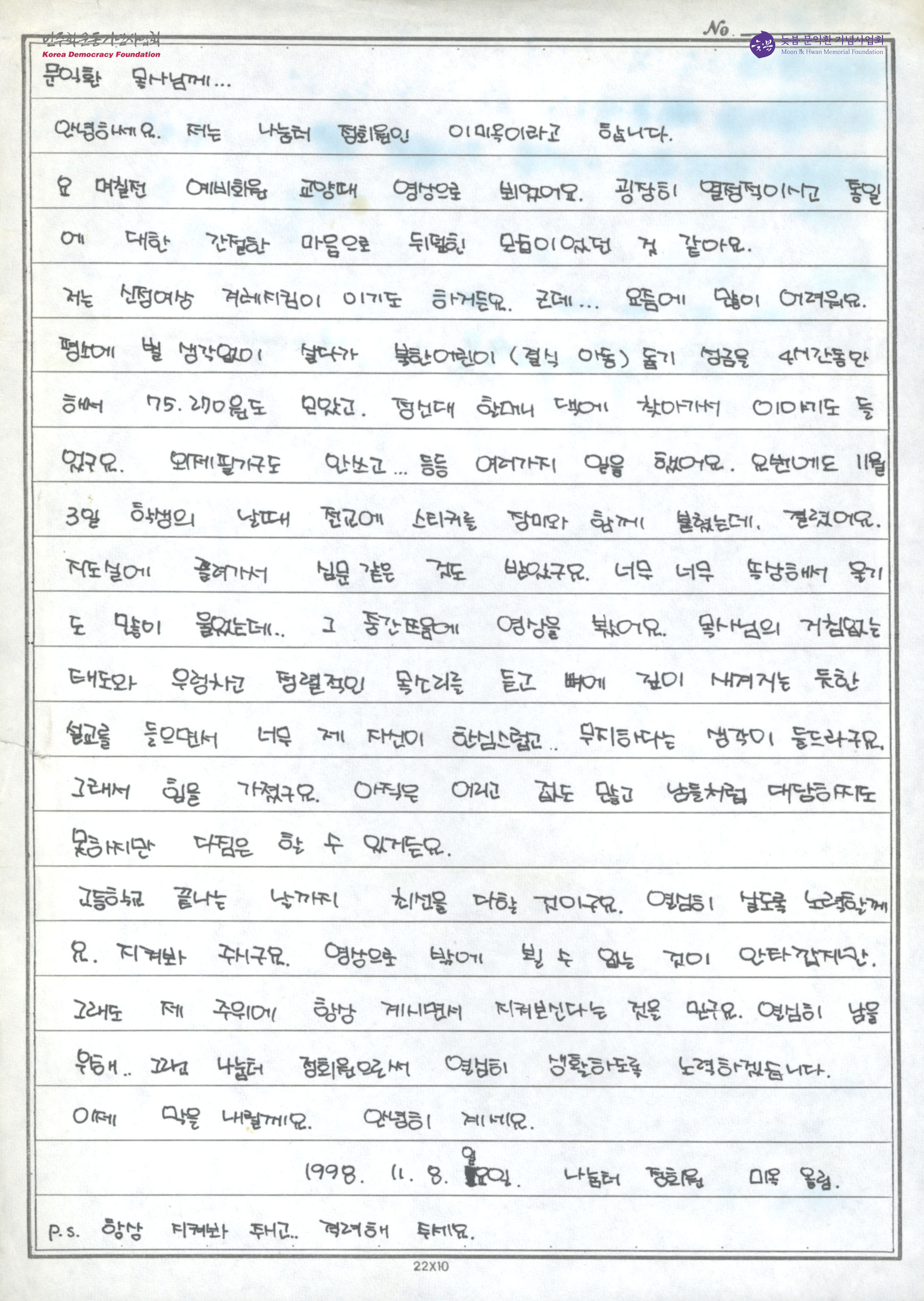 - 이미옥이 문익환 목사에게 신정여상 겨레지킴이 활동을 하면서 힘들었지만 그의 영상을 보고 다시 최선을 다하겠다는 각오를 적어 보낸 서신