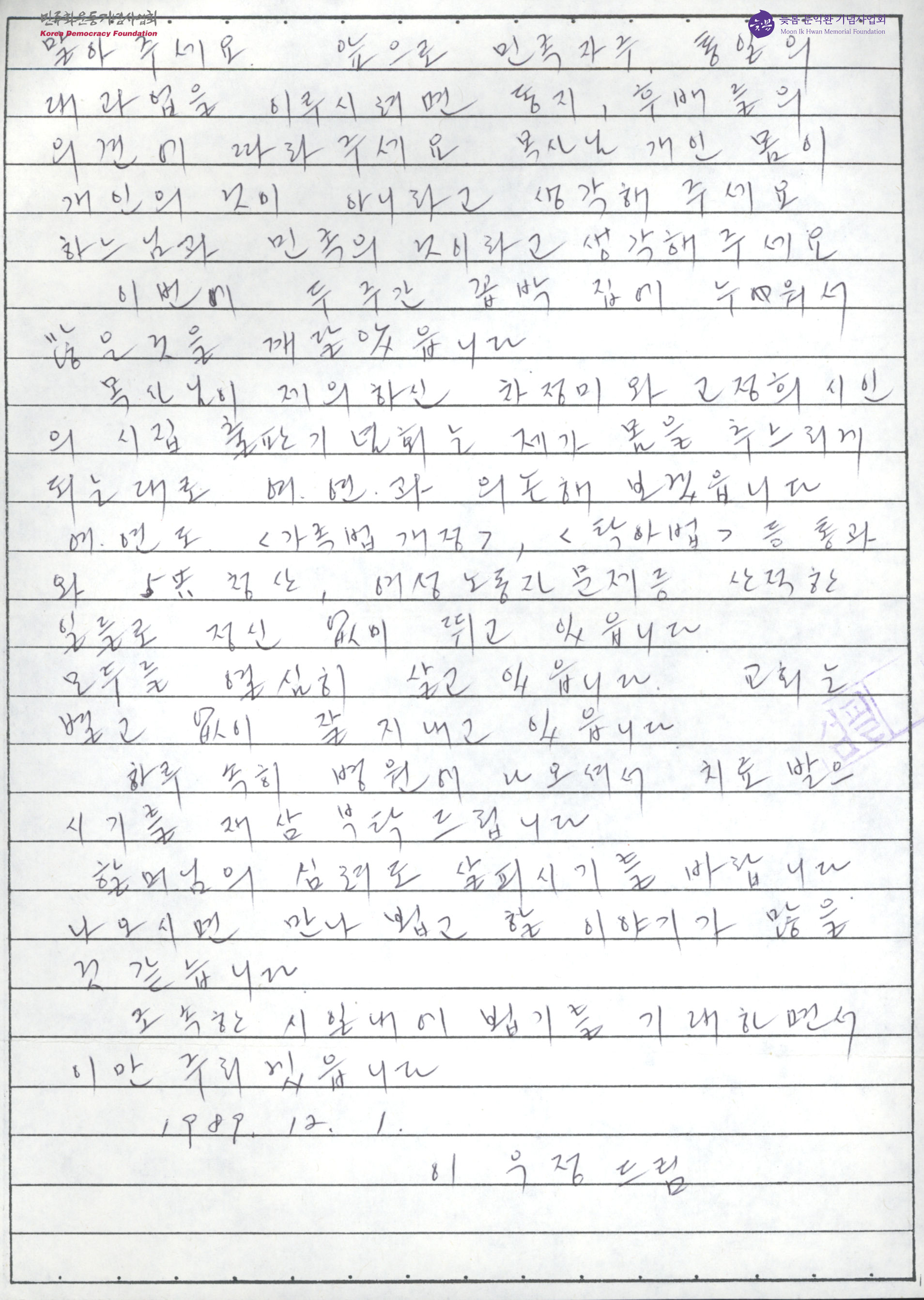 - 이우정이 문익환 목사에게 시집 출판 기념회, 한국 여성 연합의 활동과 그의 치료를 바란다는 것을 적어 보내는 서신