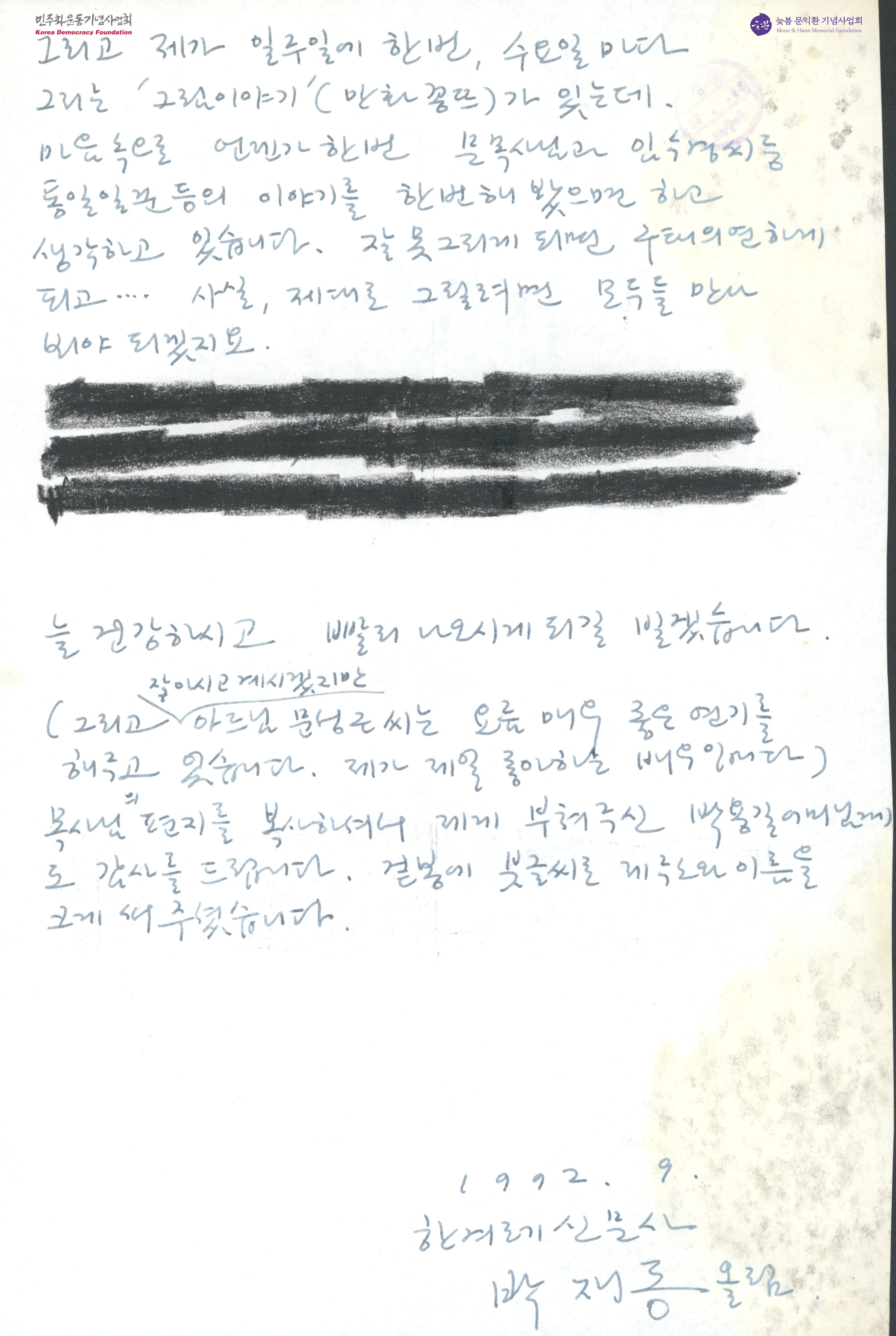 - 박재동이 문익환 목사에게 자신이 그리는 '그림이야기'에 통일 일꾼의 이야기를 한번 해봤으면 한다는 내용을 적어 보낸 서신. 박용길 장로에게 문익환 목사의 서신을 보내줘서 감사한 마음을 적은 내용이 함께 적혀있음